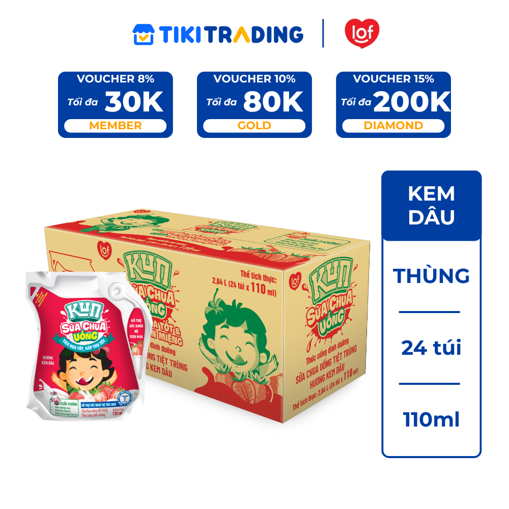 Sữa lên men tự nhiên (46%) (Nước, sữa bò tươi, bột sữa, chất béo sữa, men Streptococcus và Latobacillus), đường tinh luyện, mạch nha, chất ổn định (INS 466, INS 440), hương liệu tổng hợp (hương kem dâu), phẩm màu tự nhiên (INS 120), vitamin và khoáng chất (B1, B2, B6, kẽm lactat), lysine. Sử dụng cho trẻ trên 3 tuổi. Dùng từ 2 đến 3 túi một ngày. Lắc đều trước khi sử dụng. Sản phẩm cho 1 lần sử dụng. Ngon hơn khi uống lạnh Bảo quản nơi khô ráo và thoáng mát, tránh ánh nắng trực tiếp. Hiện tượng thay đổi màu sắc và lắng đọng tự nhiên không làm ảnh hưởng đến chất lượng sản phẩmGiá sản phẩm trên Tiki đã bao gồm thuế theo luật hiện hành. Bên cạnh đó, tuỳ vào loại sản phẩm, hình thức và địa chỉ giao hàng mà có thể phát sinh thêm chi phí khác như phí vận chuyển, phụ phí hàng cồng kềnh, thuế nhập khẩu (đối với đơn hàng giao từ nước ngoài có giá trị trên 1 triệu đồng).....