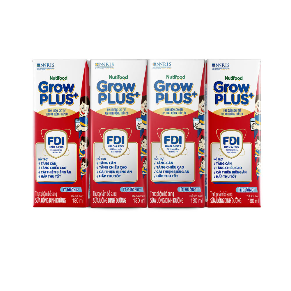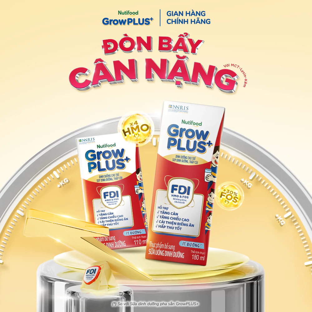 Nutifood GrowPLUS+ Nhãn hiệu Sữa trẻ em Số 1 Việt Nam với công thức FDI độc quyền nghiên cứu bởi Viện Nghiên Cứu Dinh Dưỡng Nutifood Thụy Điển, xây dựng nền tảng “Đề Kháng Khỏe, Tiêu Hóa Tốt”, với bộ đôi HMO + FOS và tăng cường gấp 2 lần DHA.