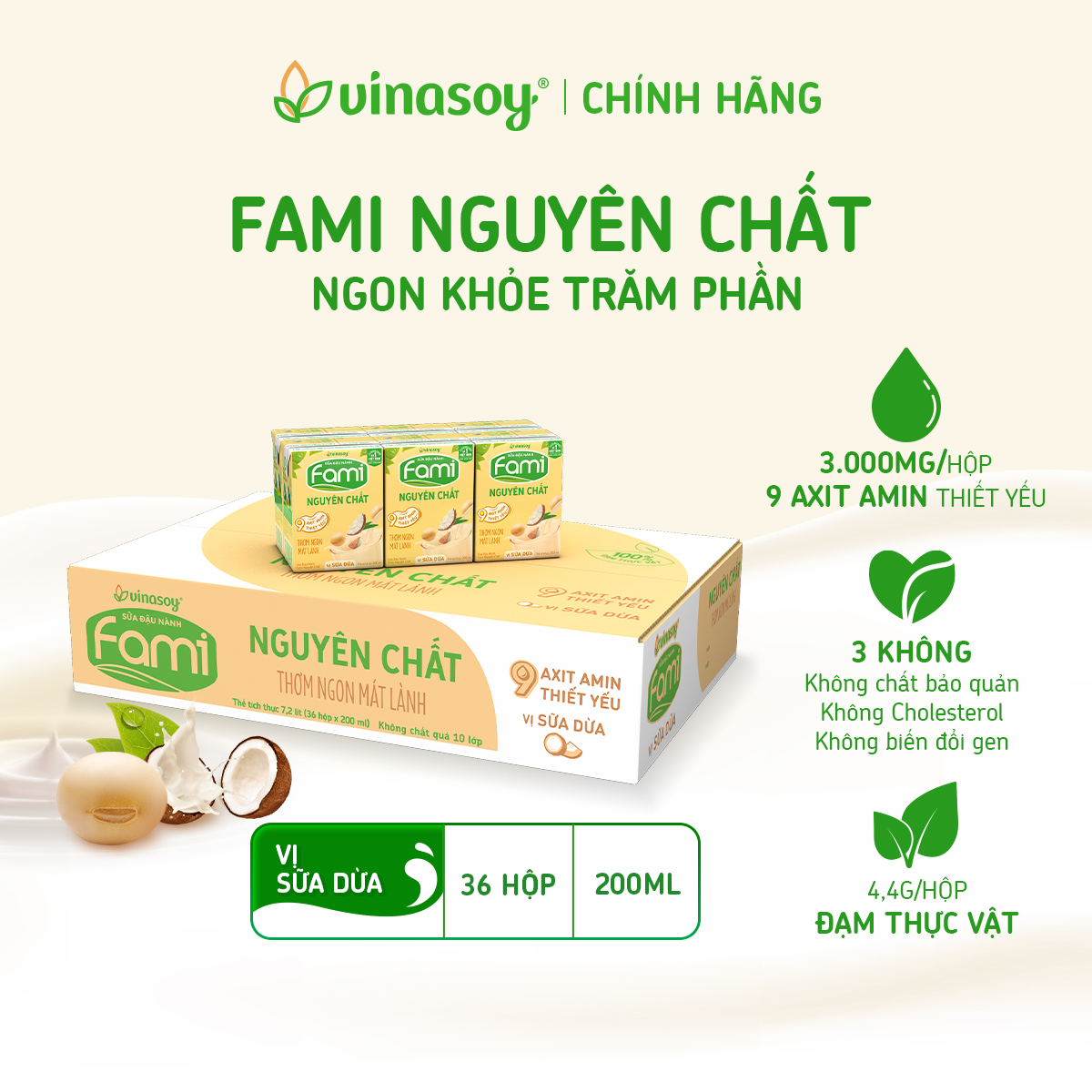 - Thùng Sữa đậu nành Fami nguyên chất vị sữa dừa (200ml x 36 Hộp) được làm từ 100% đậu nành hạt chọn lọc, không biến đổi Gen (Non - GMO) kết hợp với bột sữa dừa mang đến hương vị thơm béo tự nhiên và là nguồn cung cấp dinh dưỡng thiết yếu từ thực vật, tốt cho sức khỏe khi sử dụng hàng ngày.
