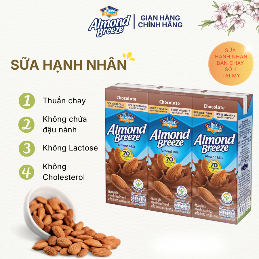Sữa hạt hạnh nhân ALMOND BREEZE (Sản phẩm của Tập đoàn BLUE DIAMOND – Mỹ) là thức uống bổ dưỡng hàng ngày tốt cho sức khỏe. Đặc biệt THÍCH HỢP VỚI KHÁCH HÀNG BỊ DỊ ỨNG VÀ KHÔNG DUNG NẠP ĐƯỢC ĐƯỜNG SỮA (Lactose); những người ăn chay; phụ nữ mang thai và cho con bú với thành phần dưỡng chất giàu Canxi và Vitamin E; không Cholesterol và không chứa các thành phần từ đậu nành và sữa.