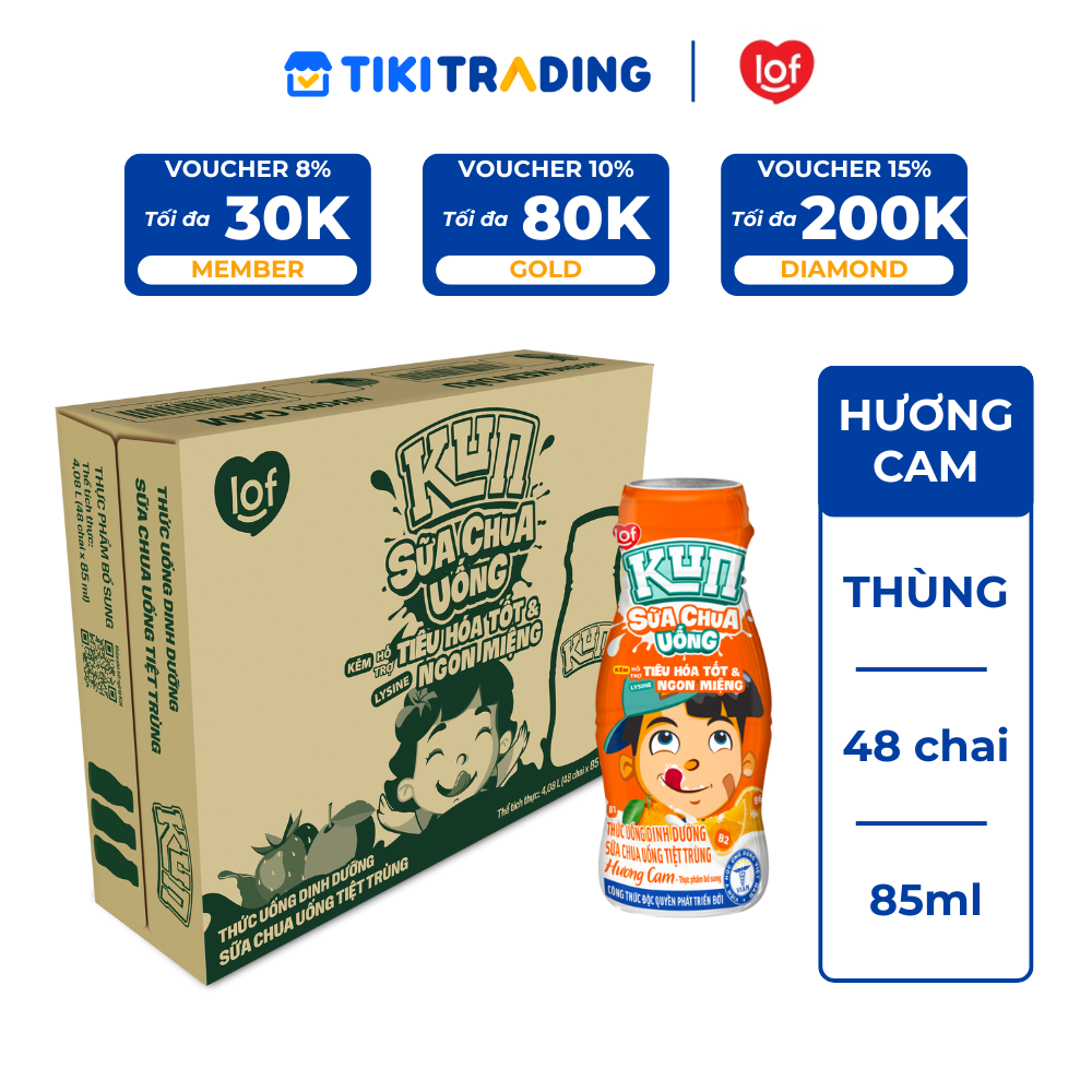 Sữa chua uống Kun được lên men tự nhiên từ sữa, công thức độc quyền hỗ trợ sức khỏe tiêu hóa kết hợp với Viện Y Học Ứng Dụng VIAM, bổ sung bộ 3 vi chất tốt cho tiêu hóa Kẽm: tiêu hóa tốt Lysine: tăng cảm giác ngon miệng Vitamin B1, B2, B6: tăng cường chuyển hóa Sữa lên men tự nhiên (46%) (Nước, sữa bò tươi, bột sữa, chất béo sữa, men Streptococcus và Latobacillus), đường tinh luyện, mạch nha, chất ổn định (INS 466, INS 440), hương liệu tổng hợp (hương cam), vitamin và khoáng chất (B1, B6, B2, kẽm lactat), lysine. Sử dụng cho trẻ trên 3 tuổi. Nên dùng từ 2 đến 3 chai một ngày. Lắc đều trước khi sử dụng. Sản phẩm cho 1 lần sử dụng. Ngon hơn khi uống lạnh Bảo quản nơi khô ráo và thoáng mát, tránh ánh nắng trực tiếp. Hiện tượng thay đổi màu sắc và lắng đọng tự nhiên không làm ảnh hưởng đến chất lượng sản phẩmGiá sản phẩm trên Tiki đã bao gồm thuế theo luật hiện hành. Bên cạnh đó, tuỳ vào loại sản phẩm, hình thức và địa chỉ giao hàng mà có thể phát sinh thêm chi phí khác như phí vận chuyển, phụ phí hàng cồng kềnh, thuế nhập khẩu (đối với đơn hàng giao từ nước ngoài có giá trị trên 1 triệu đồng).....