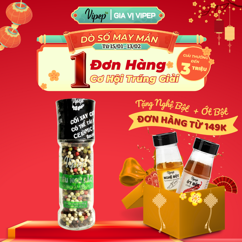 Thông số kỹ thuật Tiêu Ngũ Sắc Hạt Tự Nhiên Cối Xay Vipep Hũ Thủy Tinh 45g