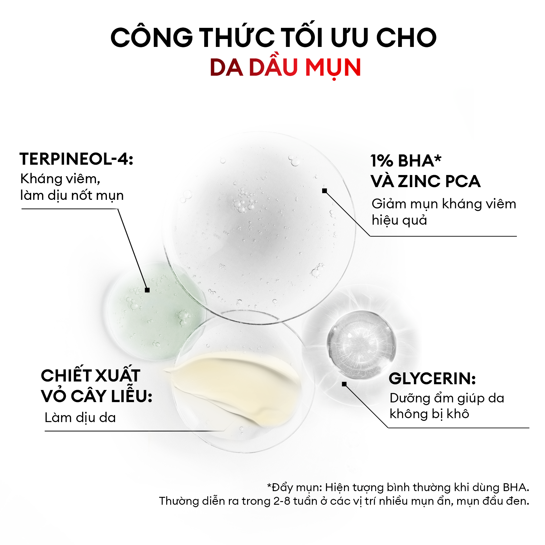 (*) Đẩy mụn: Hiện tượng bình thường khi dùng BHA. Thường diễn ra trong 2-8 tuần ở các vị trí nhiều mụn ẩn, mụn đầu đen.