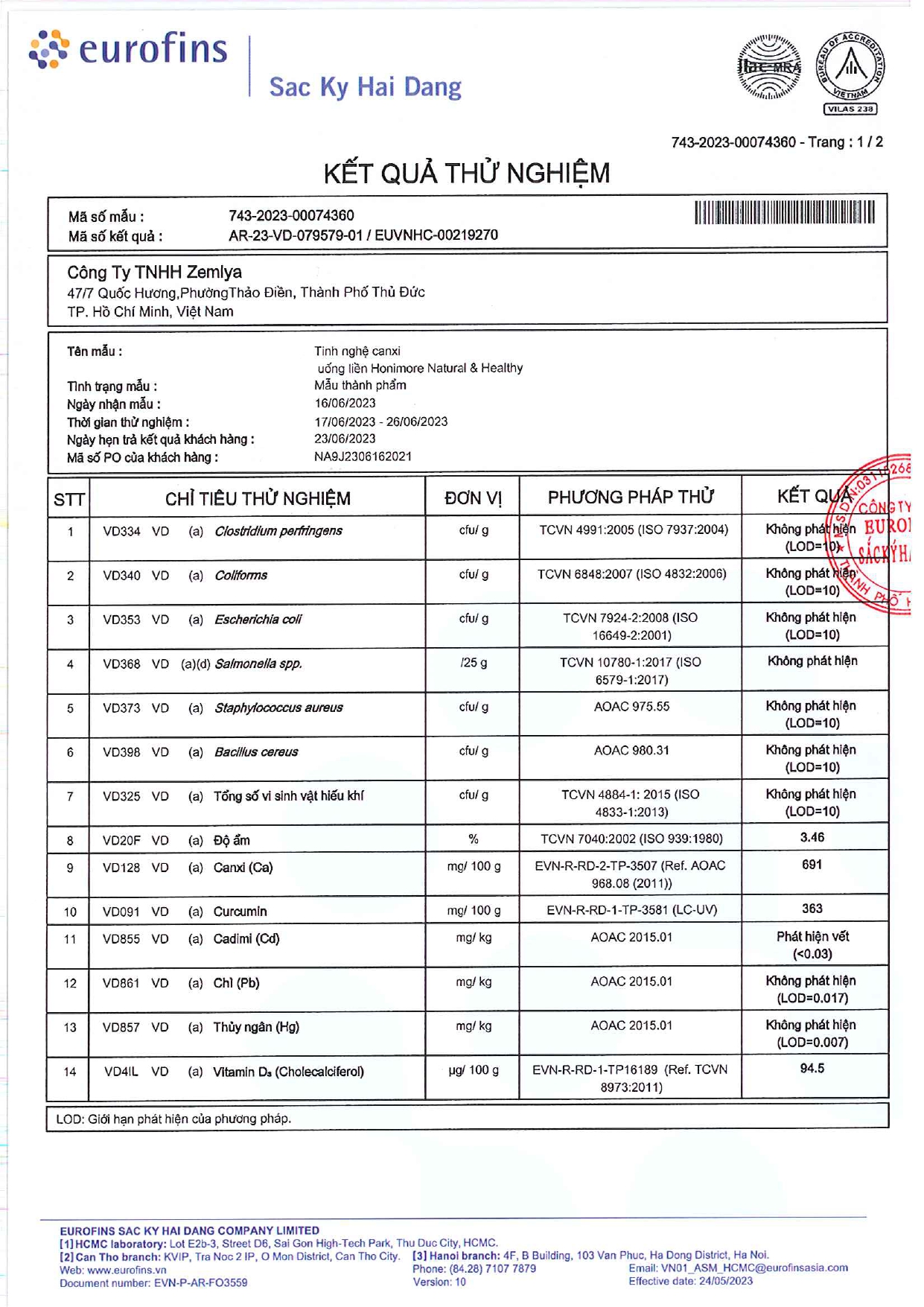 - Giấy kiểm nghiệm số AR-23-VD-079579-01 được cấp bởi Eurofins