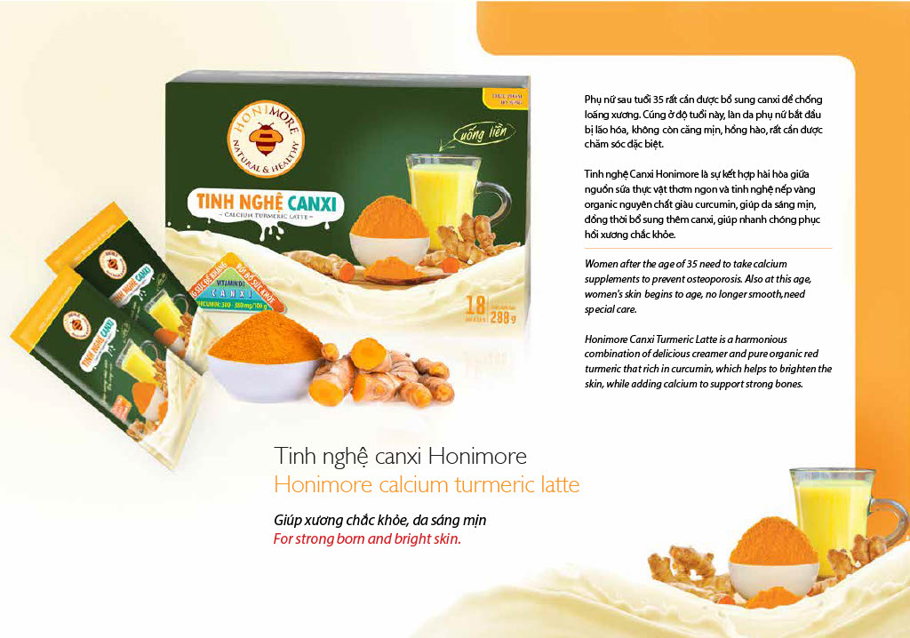 - Tinh nghệ nguyên chất canxi của Honimore là loại tinh bột nghệ nếp vàng giàu curcumin kết hợp hài hòa với bột kem (sữa thực vật) từ tinh dầu cọ thơm ngon, giúp sản phẩm trở nên dễ uống và không có mùi hăng như tinh bột nghệ nguyên chất thông thường.