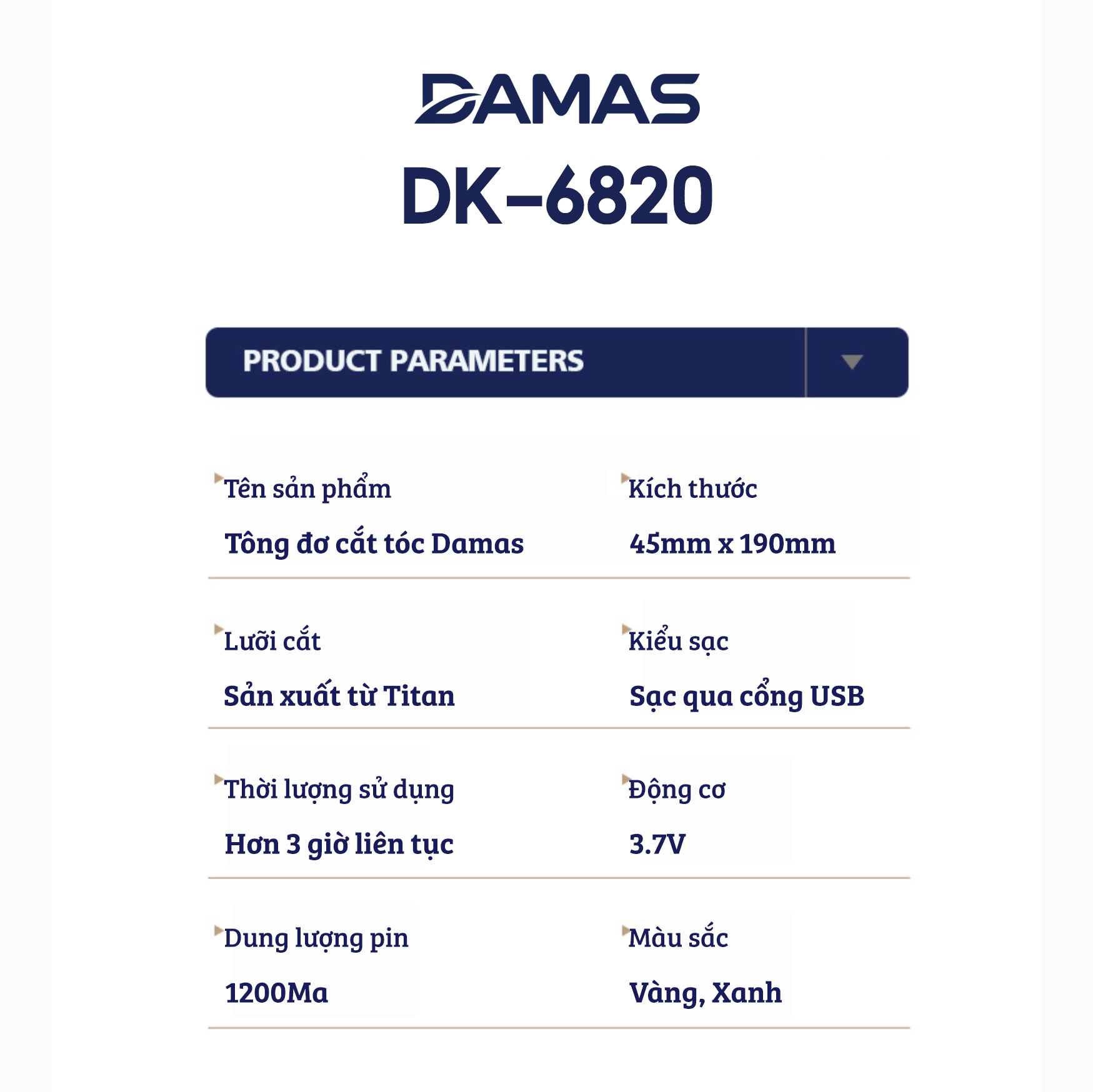 Thông số kỹ thuật Tông Đơ Cắt Tóc Damas DH-6820 – Thiết Kế Đa Năng Chống Nước Tuyệt Đối Nhỏ Gọn, An Toàn – Tặng Kèm Bộ Đồ Chuyên Dụng Chuẩn Salon – Hàng Chính Hãng