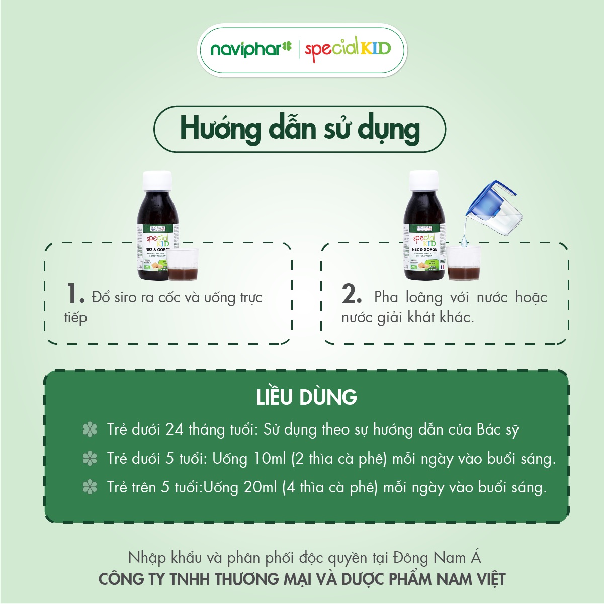 Siro Hỗ trợ Giảm viêm đường hô hấp Ngăn ngừa viêm họng, viêm phế quản, Hỗ trợ giảm viêm, giảm kích ứng, giúp thông thoáng đường thở, làm lỏng dịch phế quản và giúp long đờm, giảm các triệu chứng của viêm đường hô hấp trênTPBVSK Special Kid Nez & Gorge / Special Kid Nose & Throat 125ml [Nhập khẩu - Pháp]