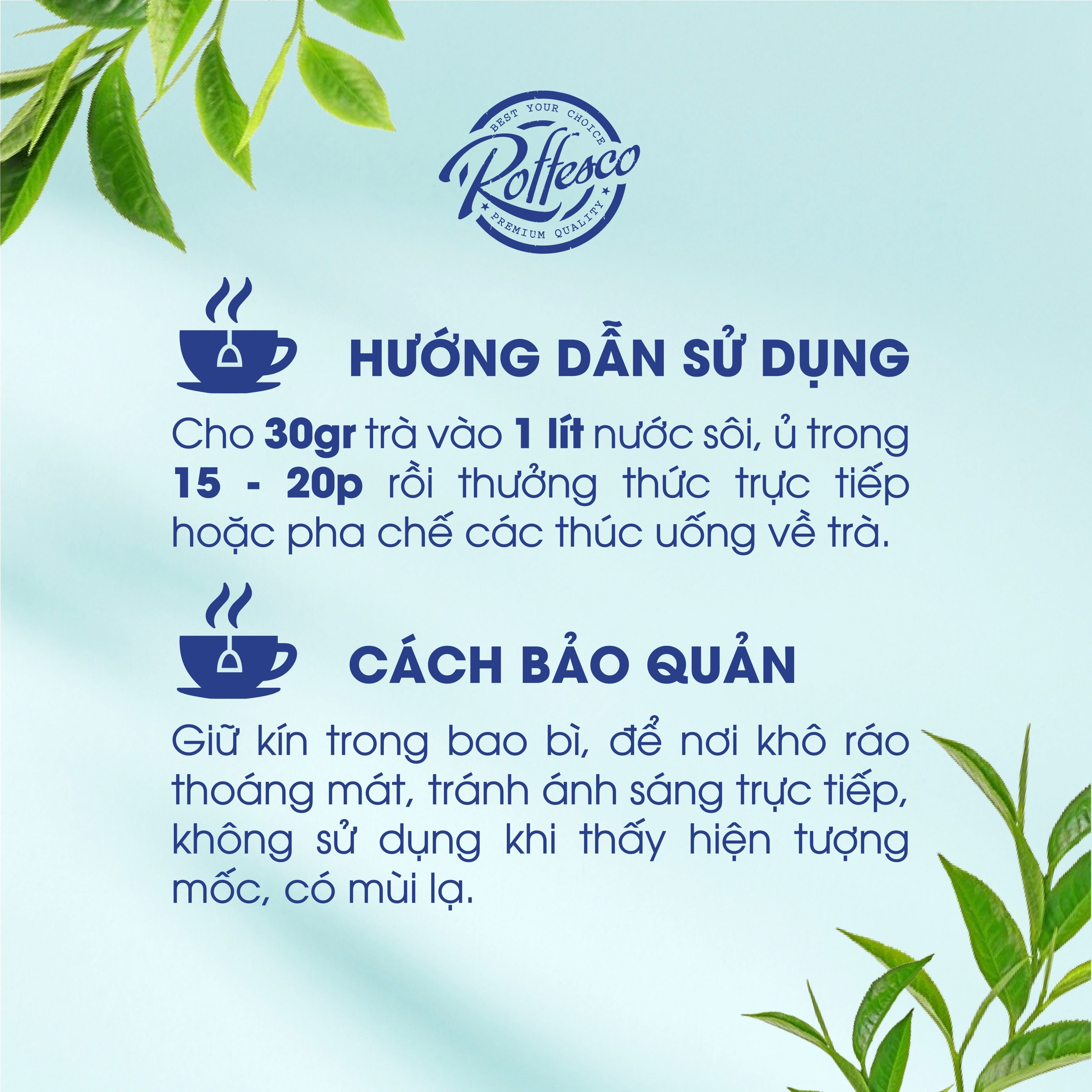 - TRÀ ROFFESCO cho 30gr trà vào 1 lít nước sôi, ủ trong 15-20 phút thưởng thức trực tiếp hoặc pha chế cách thức uống về trà