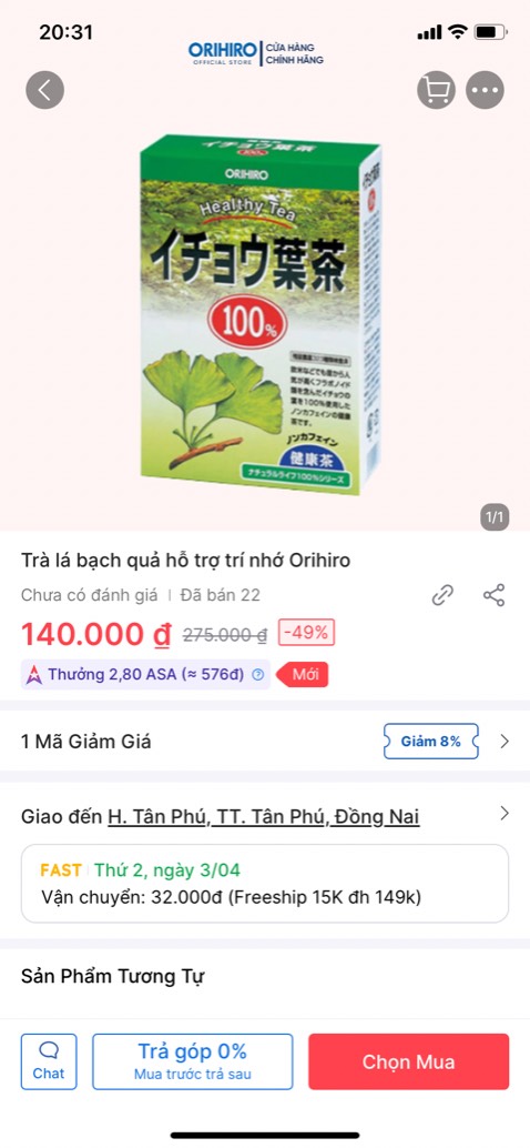 Thông số kỹ thuật Trà lá bạch quả hỗ trợ trí nhớ Orihiro
