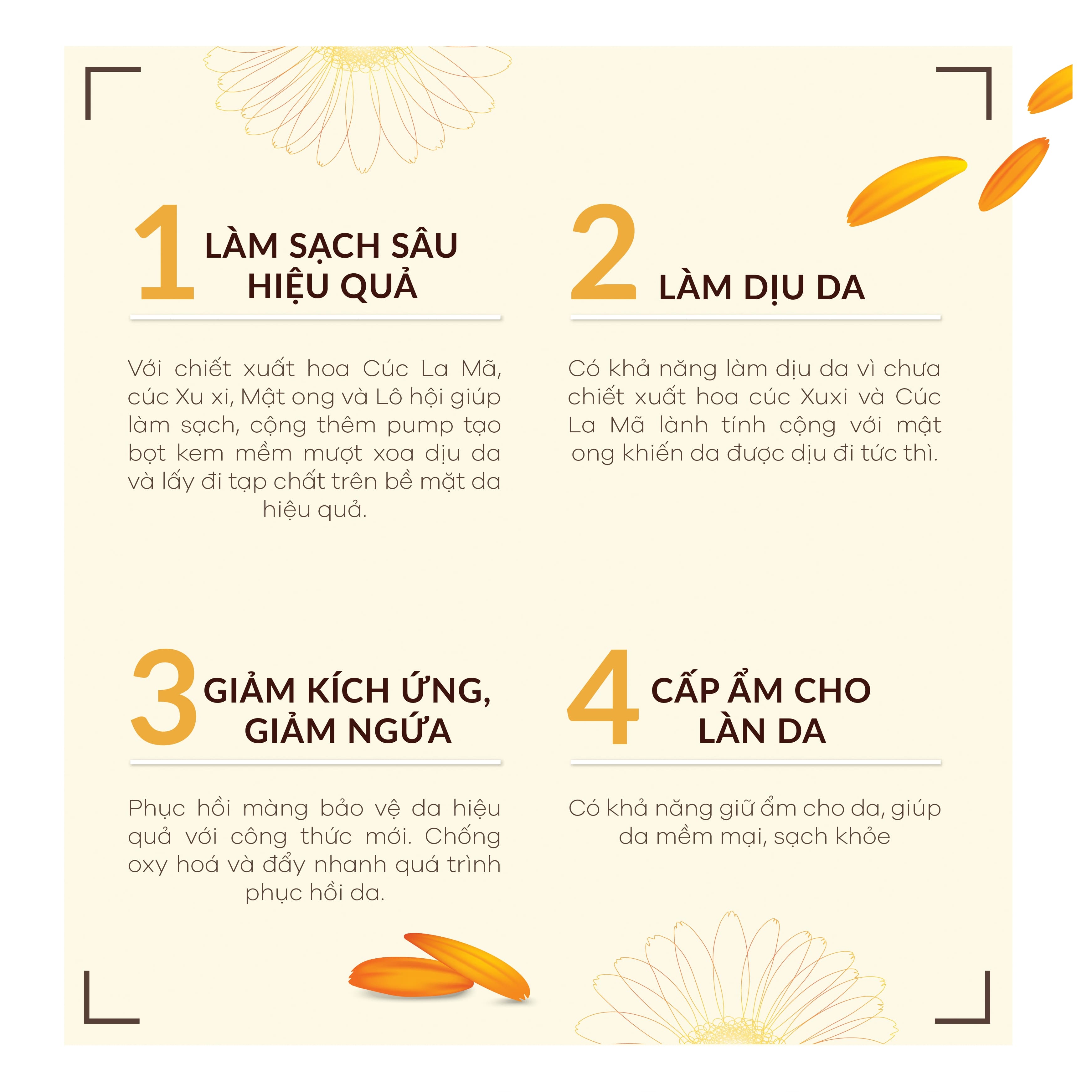 Sữa rửa mặt tạo bọt hoa cúc với sự kết hợp giữa mật ong, lô hội và chiết xuất hoa cúc La Mã, cúc Xuxi giúp cấp ẩm giúp làm giảm kích ứng, ngứa nhanh chóng phù hợp cho quá trình điều giảm mụn viêm đỏ, mụn trứng cá.