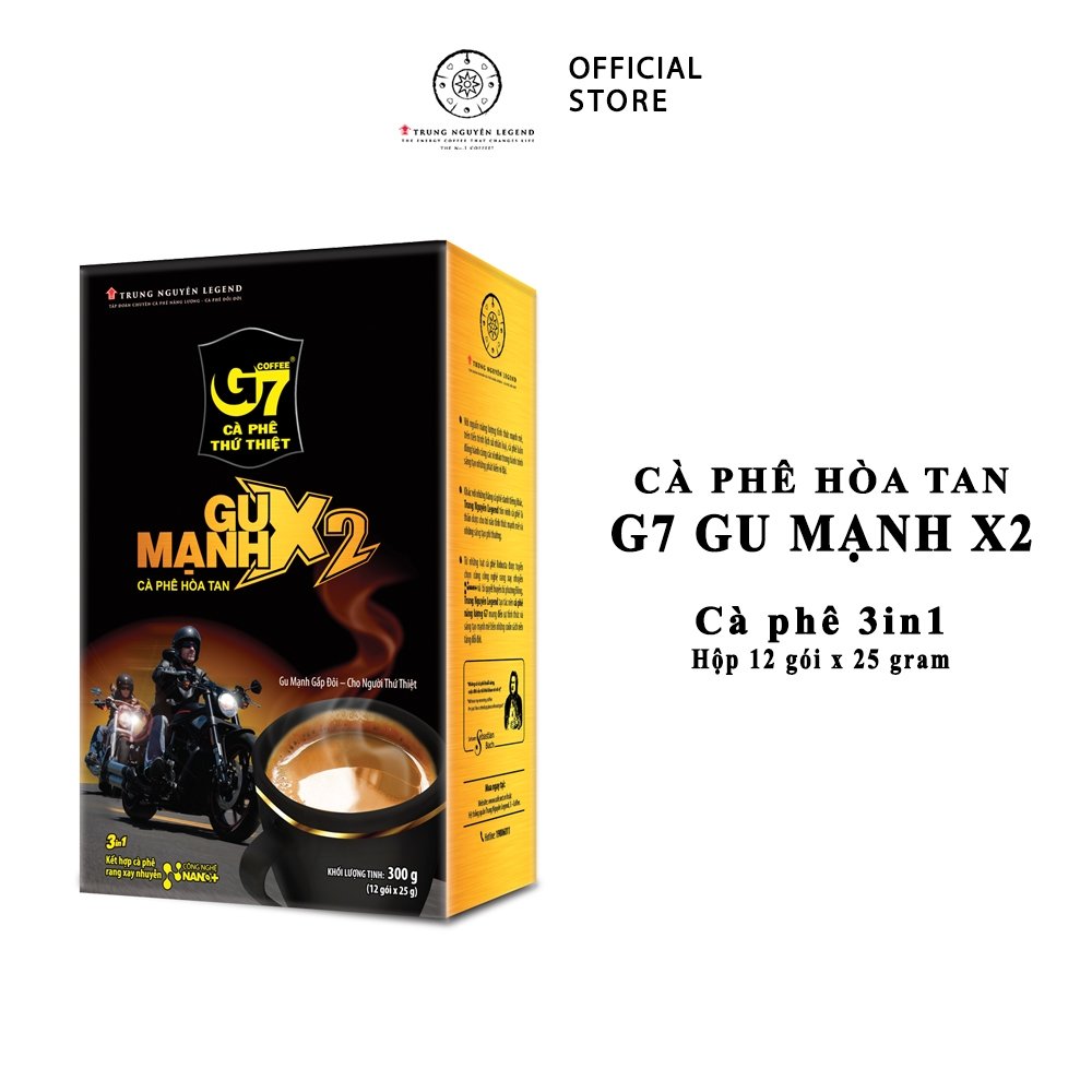 - Với loại hộp gồm 12 gói nhỏ, dễ dàng để bạn sử dụng tại văn phòng làm việc, mang theo trong những chuyến đi xa, hoặc tặng cho bạn bè, người thân lần đầu muốn thưởng thức loại cà phê hoàn tan G7 Gu Mạnh X2 của Trung Nguyên.