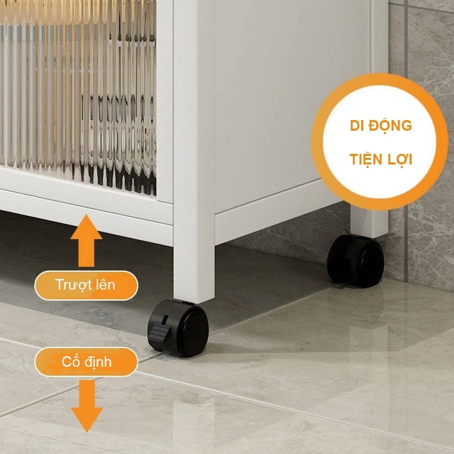 - Bánh xe 360° chịu lực tốt, thông minh cho việc vệ sinh không gian nền, di chuyển đồ vật một cách nhẹ nhàng mà không cần bê vác. Tủ có 4 chân đế cố định cho nhu cầu sử dụng của mỗi gia đình là khác nhau.
