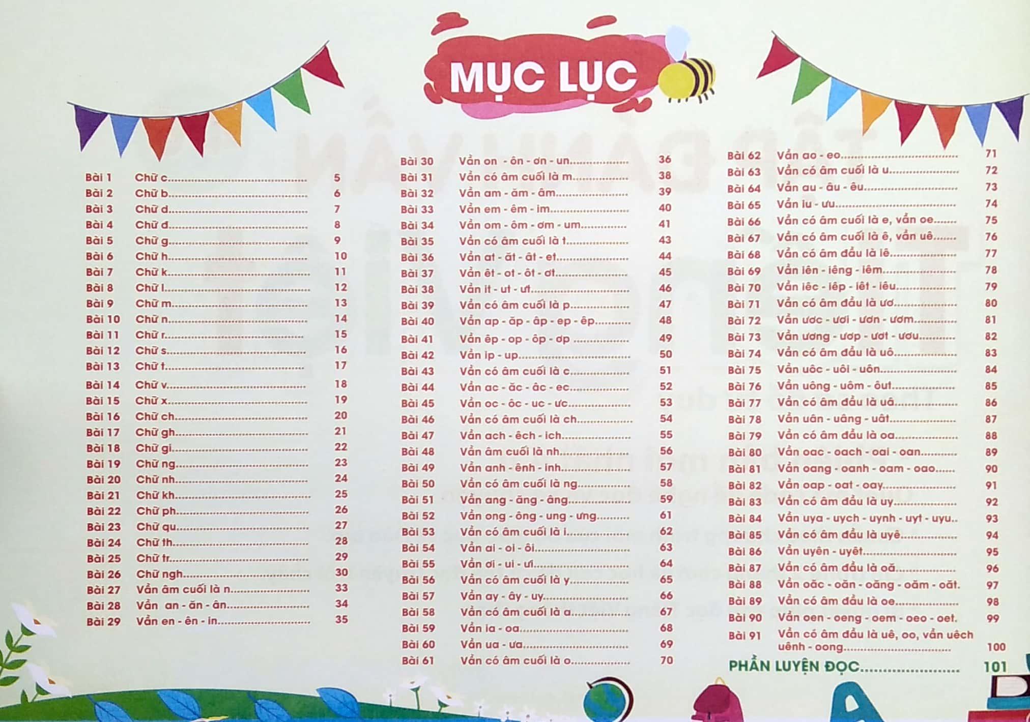 Đánh vần tiếng Việt với 124 trang cùng đầy đủ nội dung chữ cái cùng bộ học vần theo chương trình mới nhất bài học giới thiệu bảng chữ cái Tiếng Việt, dấu thanh và vần Tiếng Việt giúp các bé bước đầu làm quen với chữ viết và cách đánh vần Tiếng Việt. Mỗi bài học gồm các từ vựng, câu, đa dạng, bé tha hồ tập đánh vần, tập đọc mà không bị nhàm chán. Đặc biệt, các chữ in mầu, vẽ sơ đồ cầu trúc từ đơn giản đến phức tạp cực kỳ đễ hiểu và logic cùng màu sắc tươi tắn khiến cho việc học trở nên thú vị hơn.