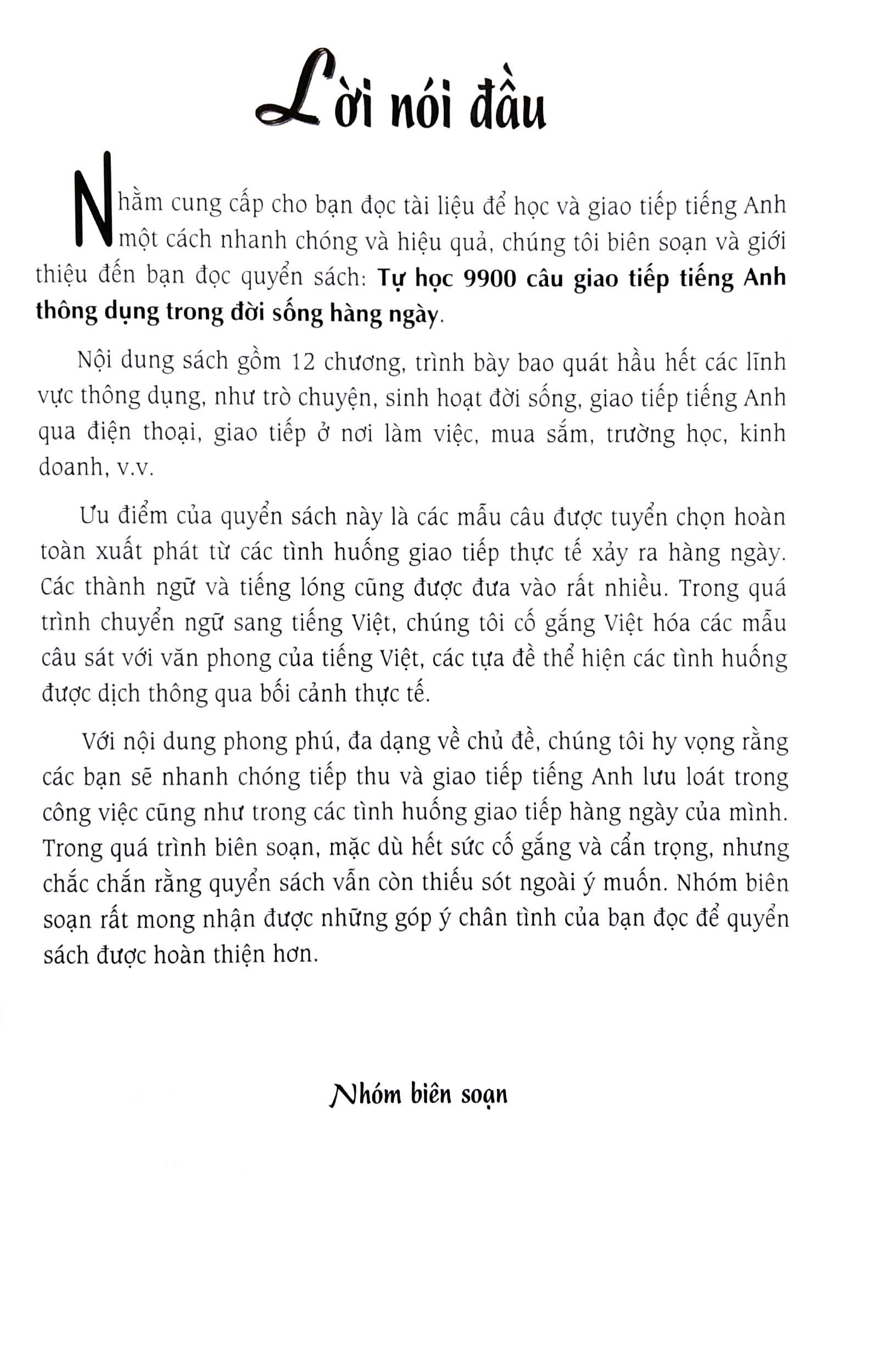 Nhằm cung cấp cho bạn đọc tài liệu để học và giao tiếp tiếng Anh một cách nhanh chóng và hiệu quả, chúng tôi biên soạn và giới thiệu đến bạn đọc quyển sách: Tự học 9900 câu giao tiếp tiếng Anh thông dụng trong đời sống hàng ngày.