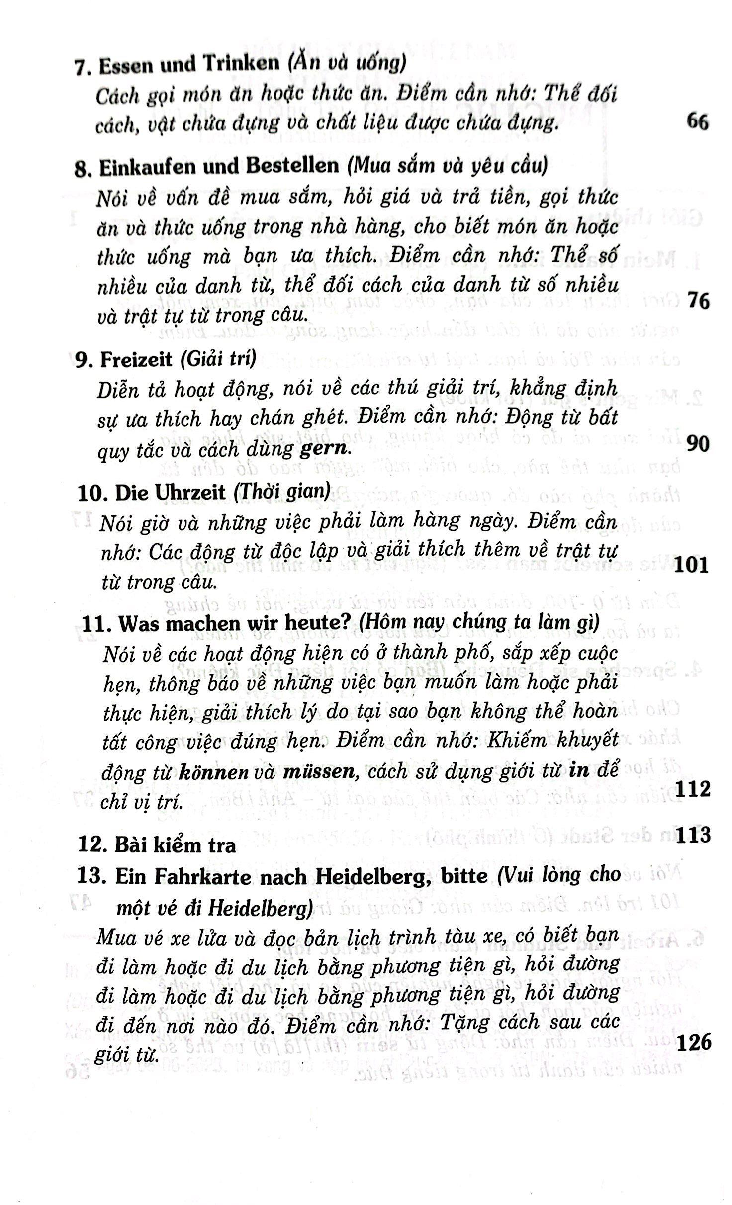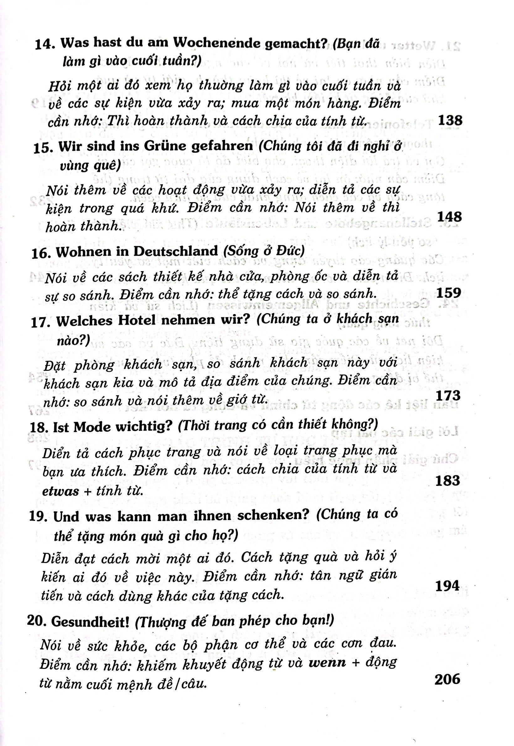 - Bài học với các bài hội thoại sinh động, chú giải ngữ pháp, bài tập ứng dụng. Ngoài ra còn có phần thông tin về đất nước và con người Đức qua các lễ hội truyền thống và lối sống đặc thù của họ.