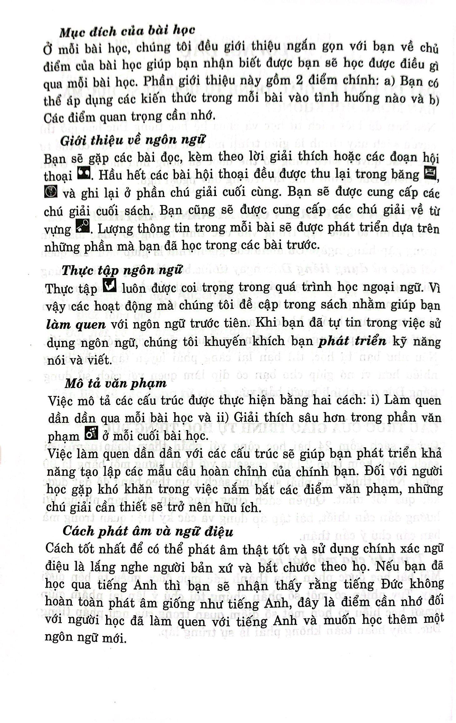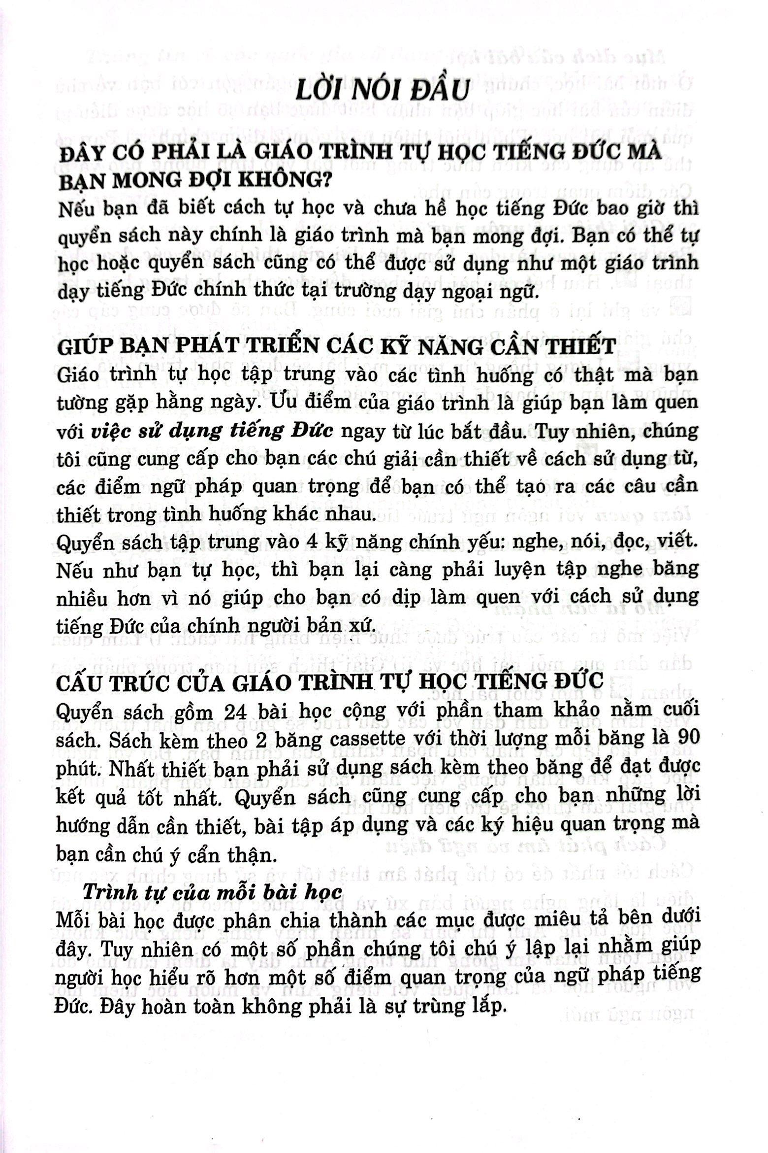Đây là giáo trình tự học tiếng Đức hoàn chỉnh nhất và được biên soạn công phu nhàm giúp người học phát triển cả 4 kỹ năng: Nghe, Nói, Đọc, Viết. Ngoài ra phần chú thích giải ngữ pháp và bài tập áp dung giúp cho các học viên tự phát triển, xây dựng các mẫu câu căn bản và từ đó nâng dàn thành các mẫu câu phức tạp hơn đủ để diễn giải các tình huống thường gặp. Paul Coggle & Heiner Schenke, tác giả của giáo trình tự học này đồng thời cũng là giảng viên tiếng Đức tại viện đại học Luân Đôn Anh Quốc, đã đúc kết nhiều năm kinh nghiệm dạy tiếng Đức cho người nước ngoài.