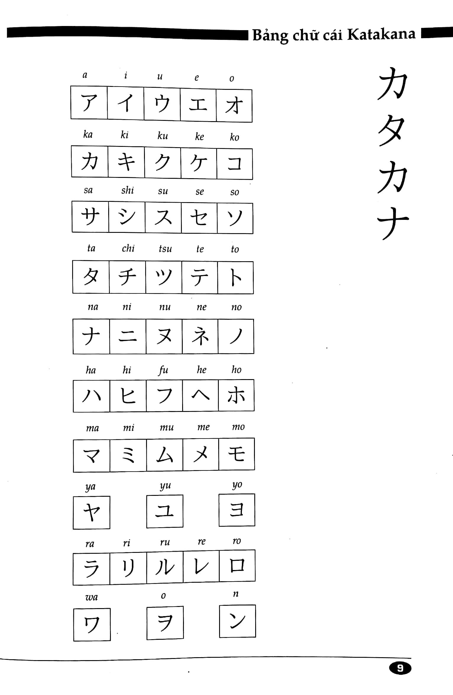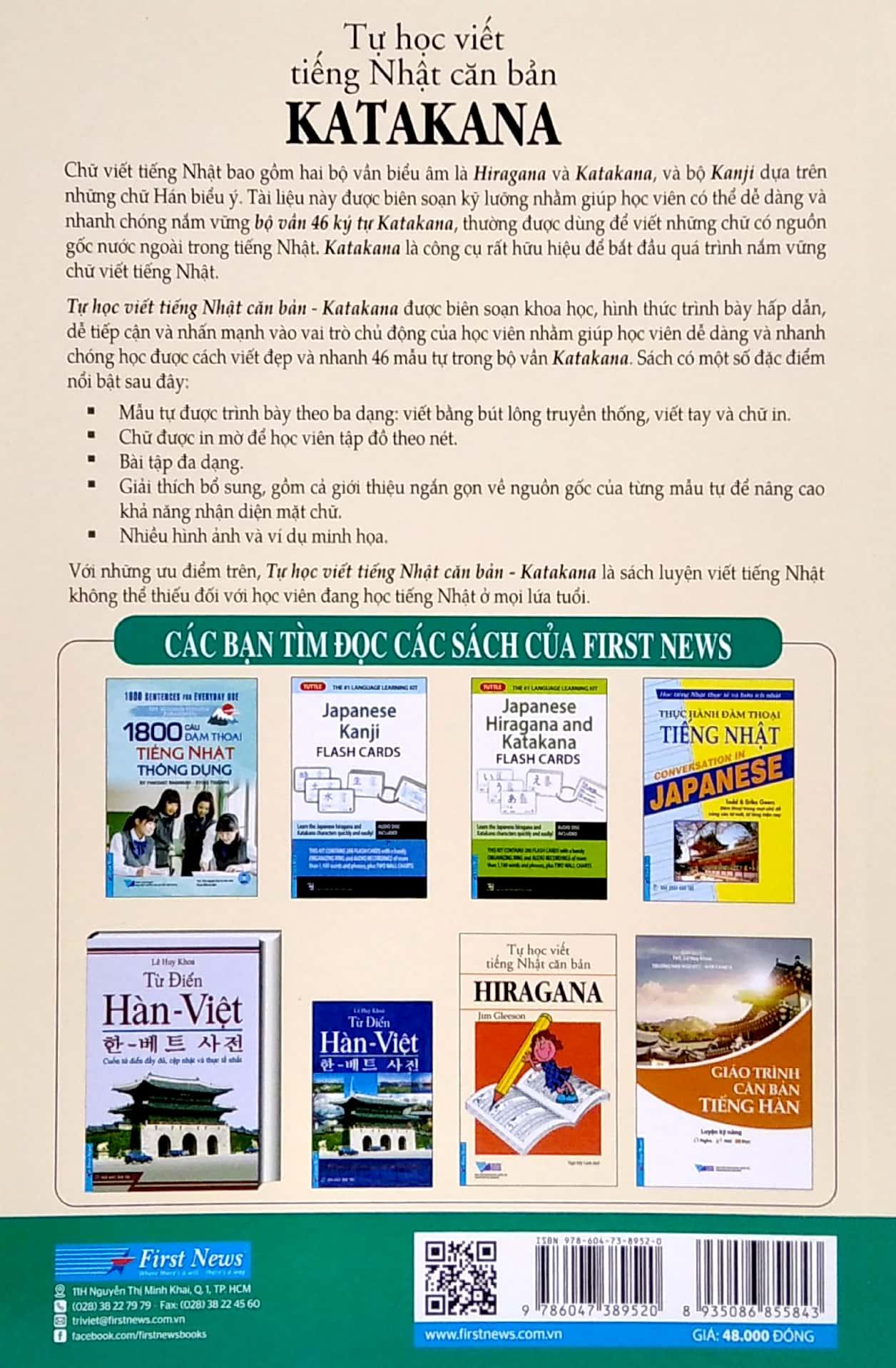 Cuốn sách Katakana - Tự Học Viết Tiếng Nhật Căn Bản được biên soạn nhằm giúp cho những học viên mới có thể làm quen với tiếng Nhật một cách nhanh nhất. Do đó mọi ưu tiên đều được tập trung kích thích vào sự tham gia của giáo viên, với khối lượng đa dạng các câu và thành ngữ thực hành để củng cố cho học viên những ký tự đã học trong mỗi giai đoạ. Sách cũng tạo cho học viên học một cách dễ dàng bằng những ký tự màu xám nhạt theo nét chữ, cho phép học viên nắm vững được cách viết, đường nét và sự cân bằng của các ký tự.