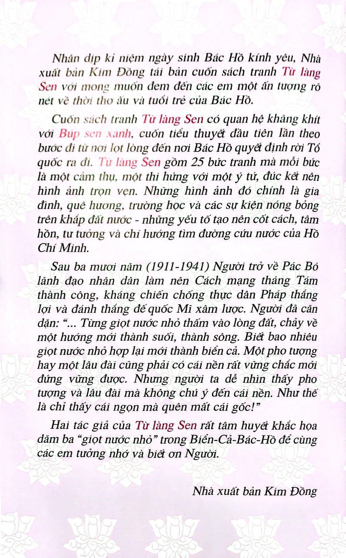 Cuốn sách “Từ làng Sen” với lời kể ngắn gọn súc tích của nhà văn Sơn Tùng và 25 bức tranh minh họa màu nước ấm áp của họa sĩ Lê Lam, được long trọng ra đời vào dịp kỷ niệm 100 năm ngày sinh chủ tịch Hồ Chí Minh (19/5/1990).