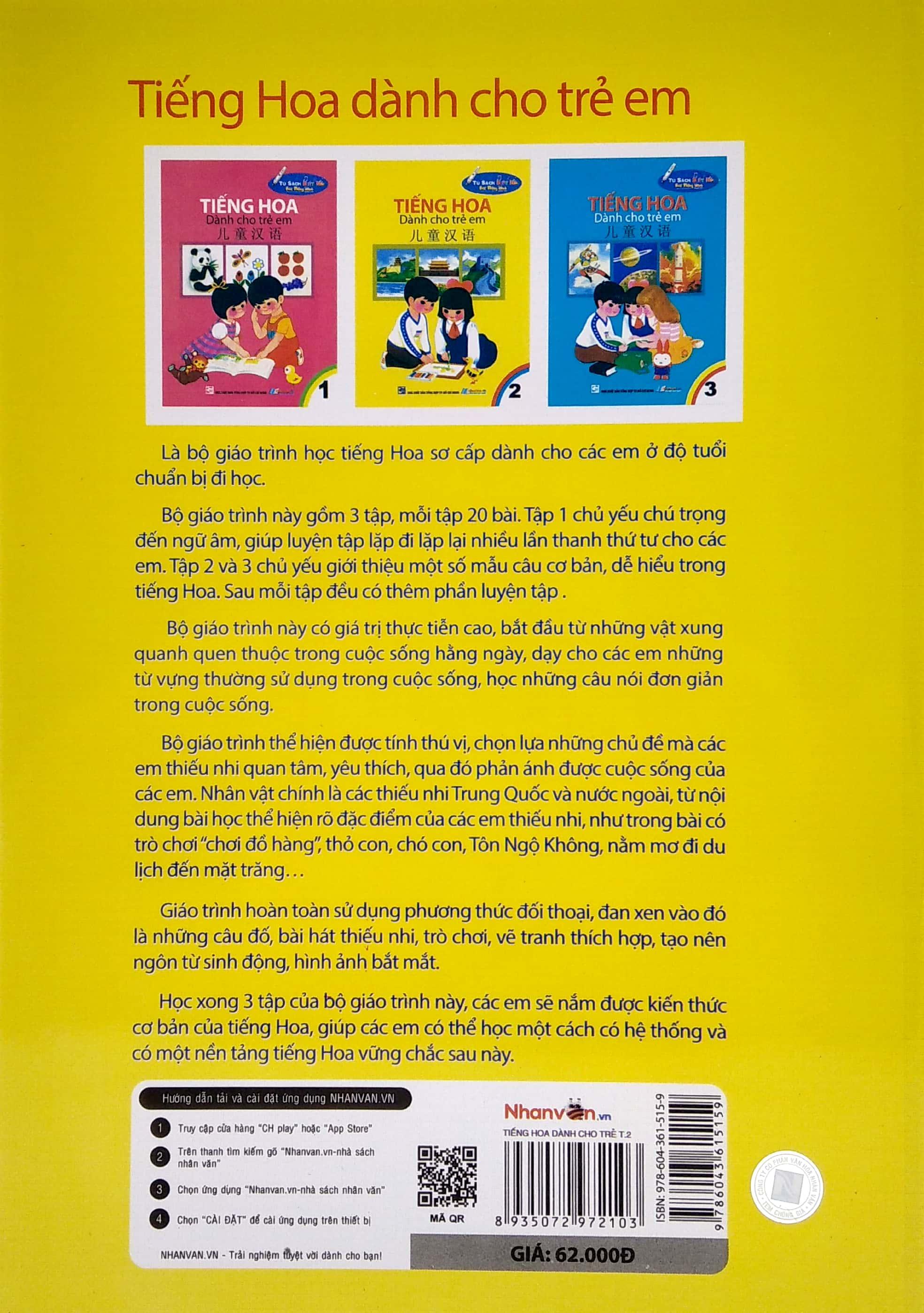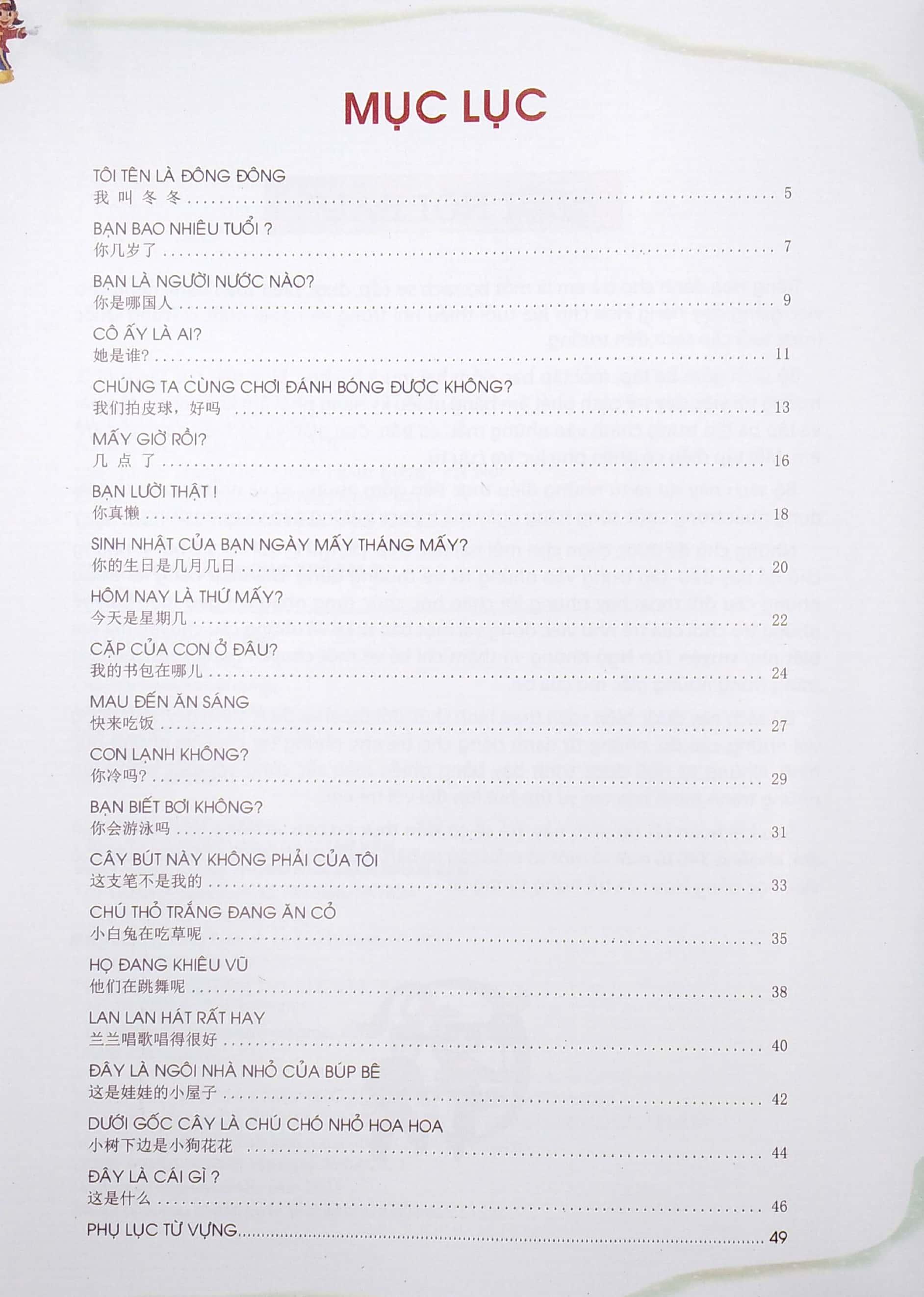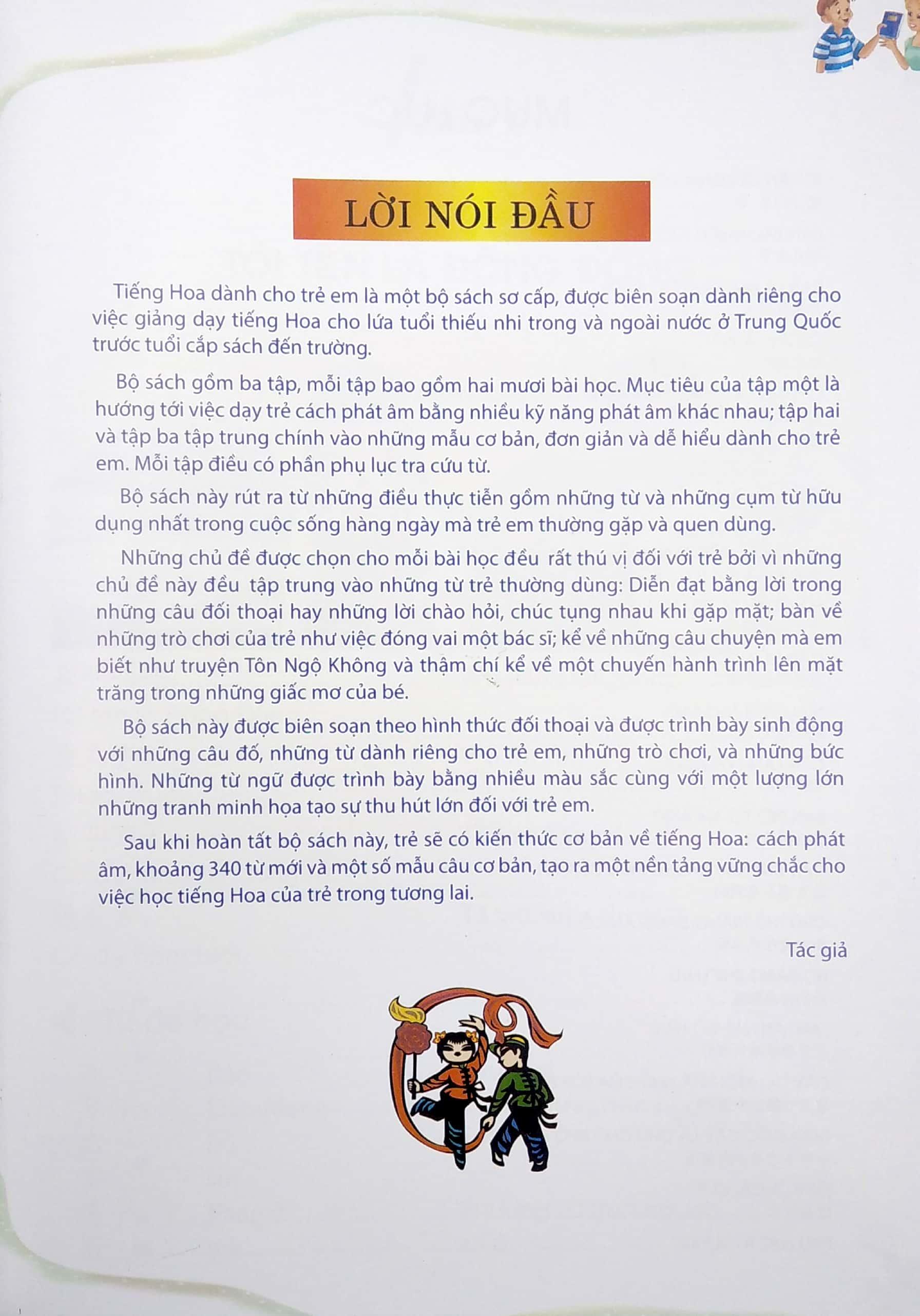Sách sẽ gúp các em có được những kiến thức cơ bản nhất về ngôn ngữ tiếng Hoa, cách phát âm, từ mới và một số mẫu câu cơ bản. Điều này tạo ra một nền tảng vững chắc cho việc học ngôn ngữ tiếng Hoa của trẻ em trong tương lai.
