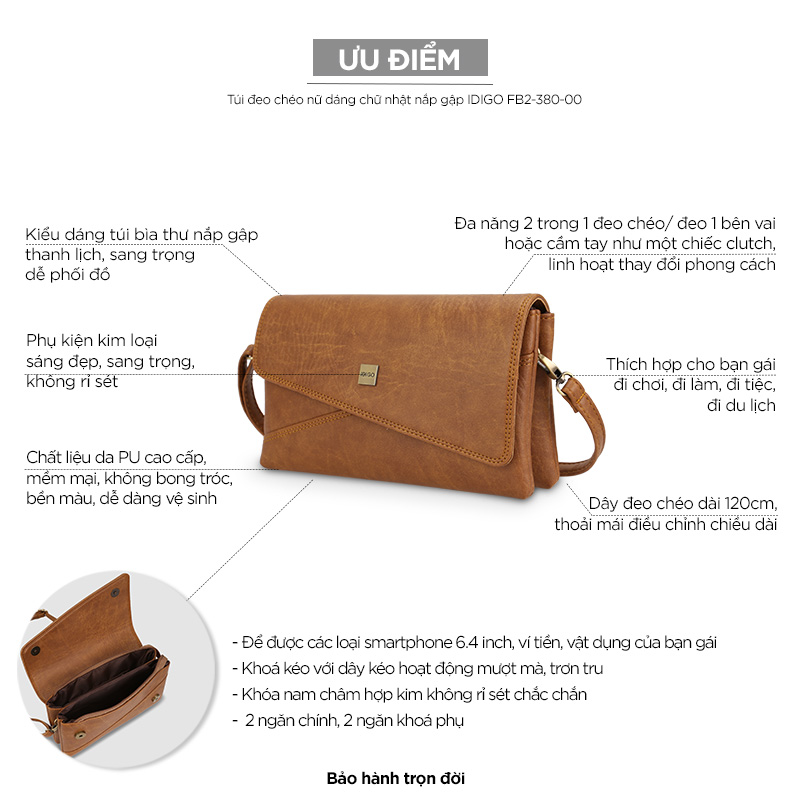 Thông số kỹ thuật Túi đeo chéo nữ thanh lịch IDIGO FB2 - 380, túi xách cầm tay dáng chữ nhật nắp gập