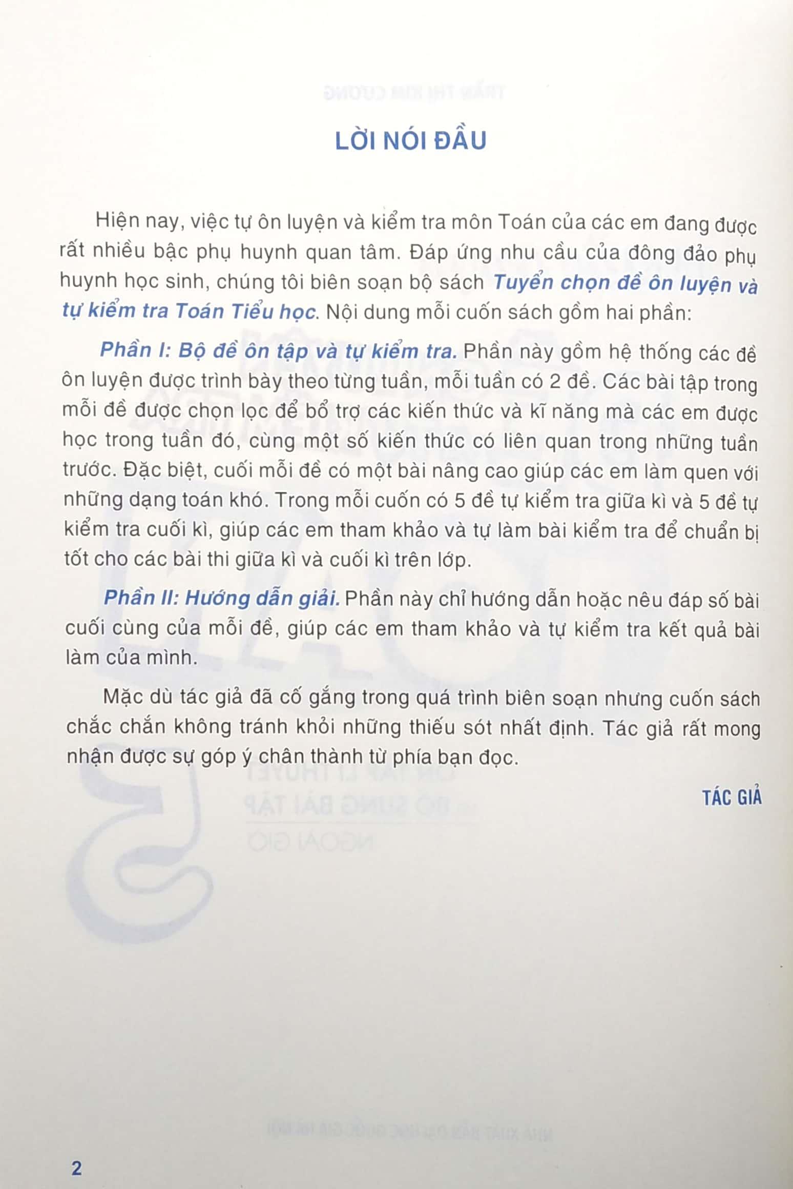 Hiện nay, việc tự ôn luyện và kiểm tra môn Toán của các em đang được rất nhiều bậc phụ huynh quan tâm. Đáp ứng nhu cầu của đông đảo phụ huynh, chúng tôi biên soạn bộ sách "Tuyển chọn đề ôn luyện và tự kiểm tra Toán tiểu học". Nội dung mỗi cuốn sách gồm 2 phần: