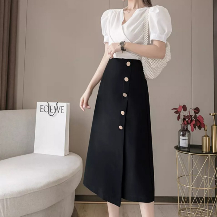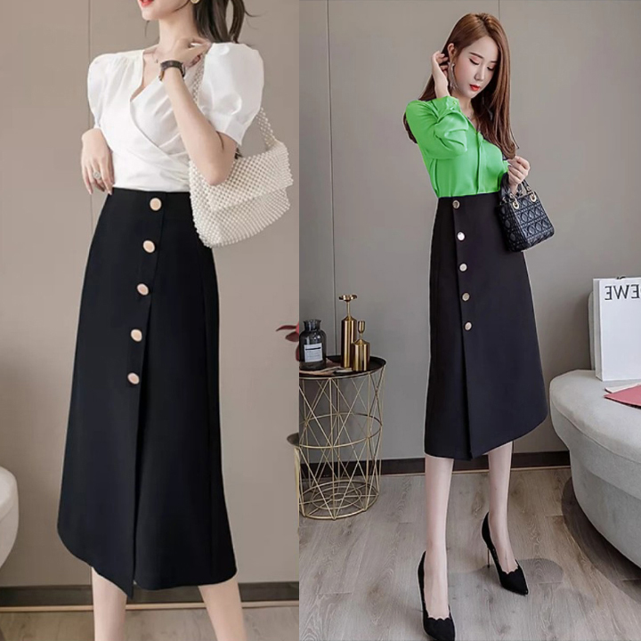 ️Chân váy lưng cao phía trước có nút rất duyên dáng tạo điểm nhấn riêng cho sản phẩm.