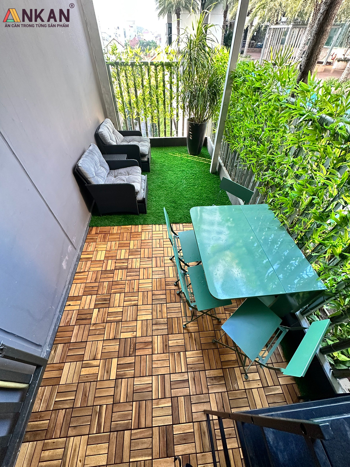 Vỉ cỏ nhân tạo kết hợp với vỉ gỗ lót sàn ban công nan 6 giúp cho không gian tươi mới và hiện đại.