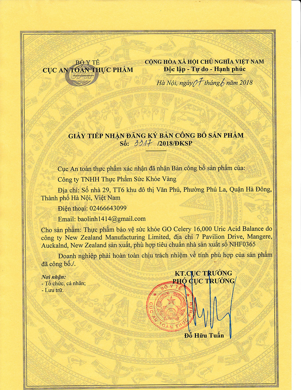 (Theo Giấy đăng ký sản phẩm của Bộ Y Tế: 3317/2018/ ĐKSP)