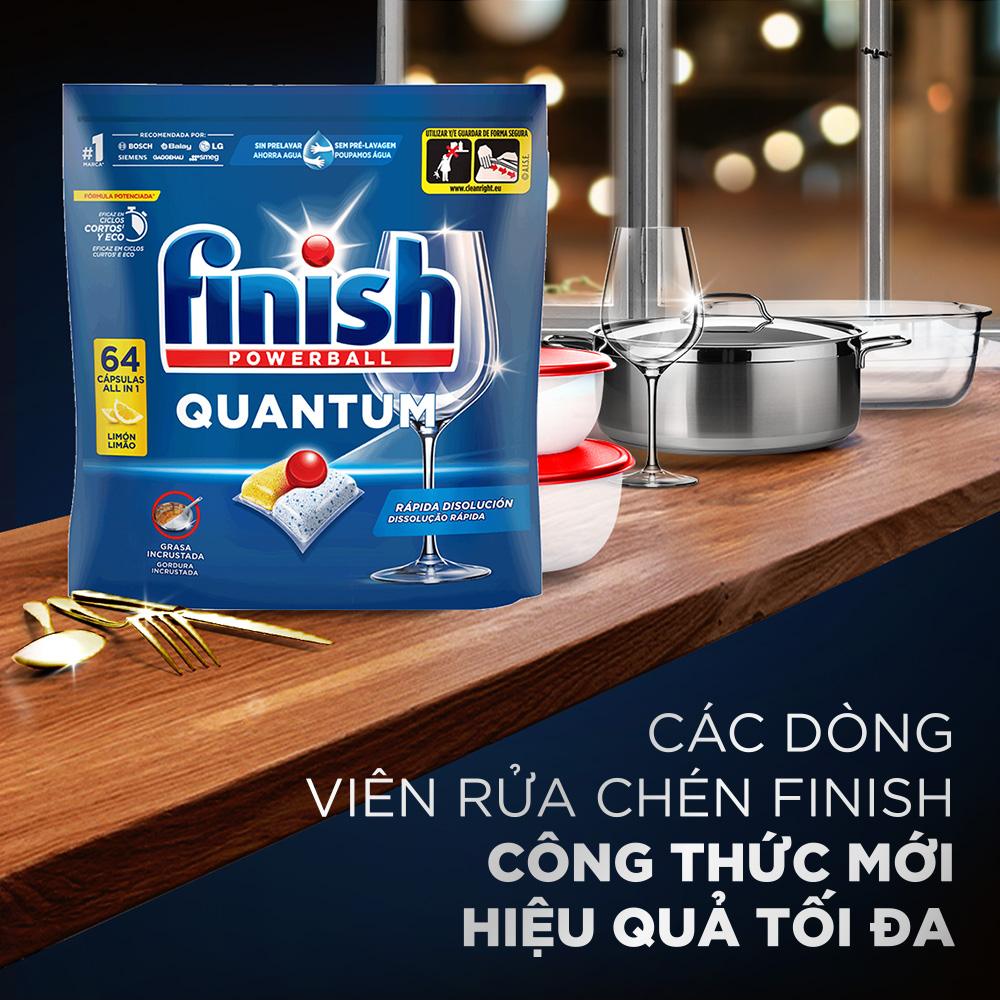 Viên rửa chén Finish Powerball Quantum Powerful Clean & Shine sức mạnh vượt trội, tẩy sạch vết bẩn cứng đầu. Finish giúp chén dĩa sạch sẽ và sáng bóng chỉ sau 1 lần rửa!