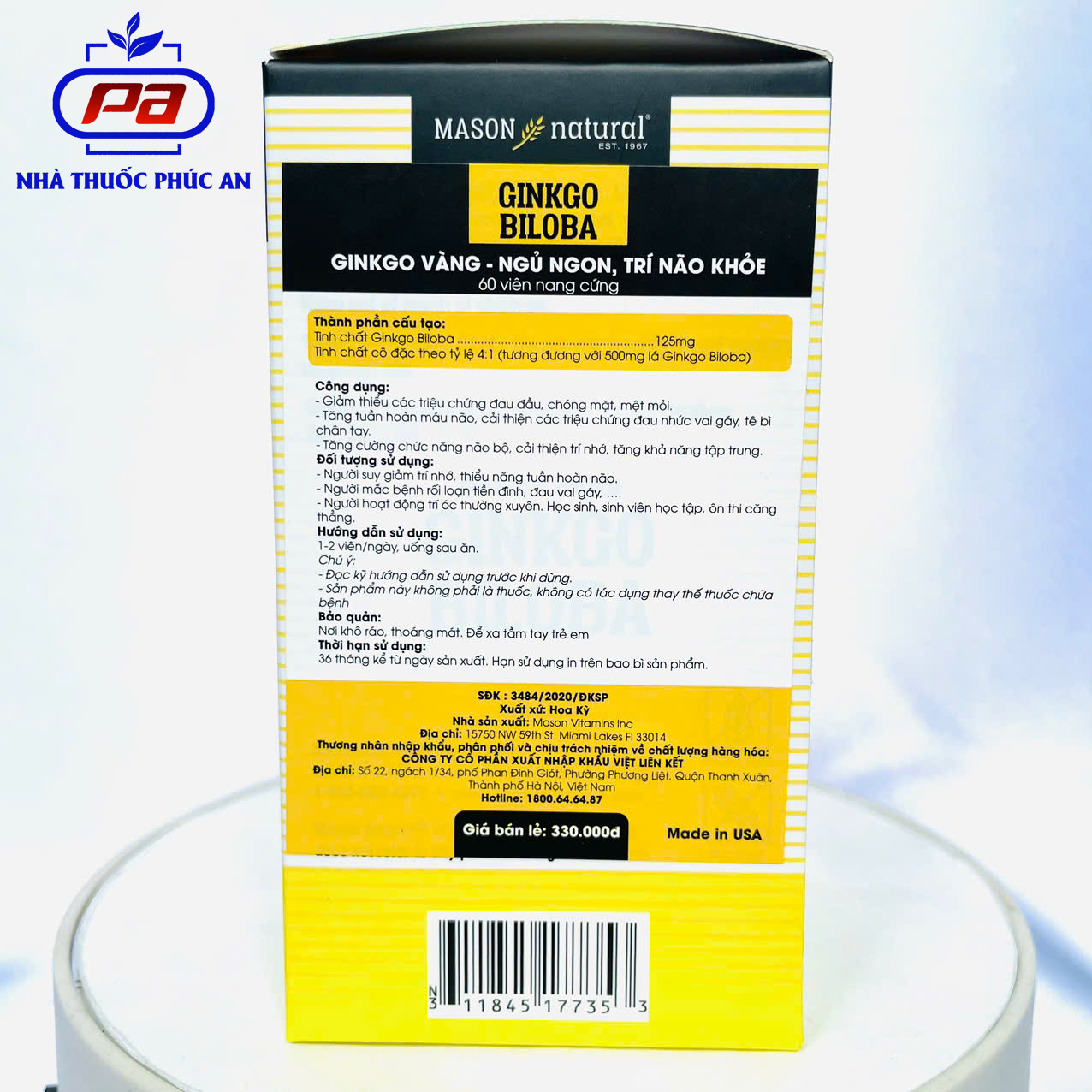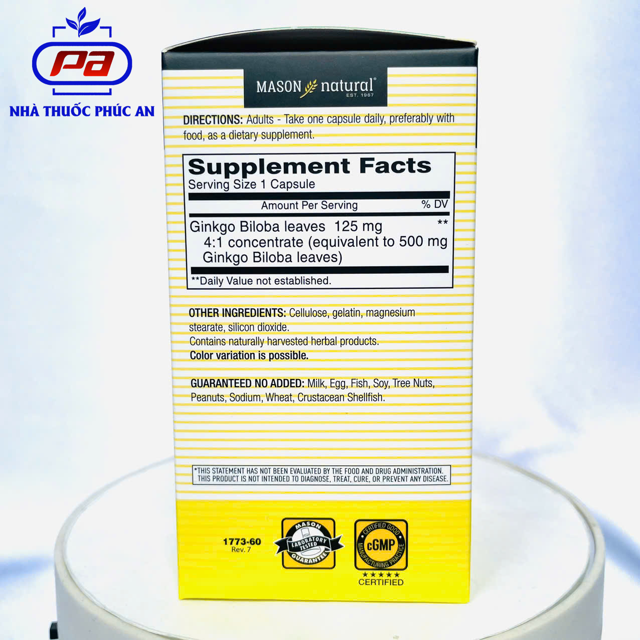 Thông số kỹ thuật Viên uống bổ não hỗ trợ tăng tuần hoàn não trí nhớ Mason Natural Ginkgo Biloba Mỹ 60 viên