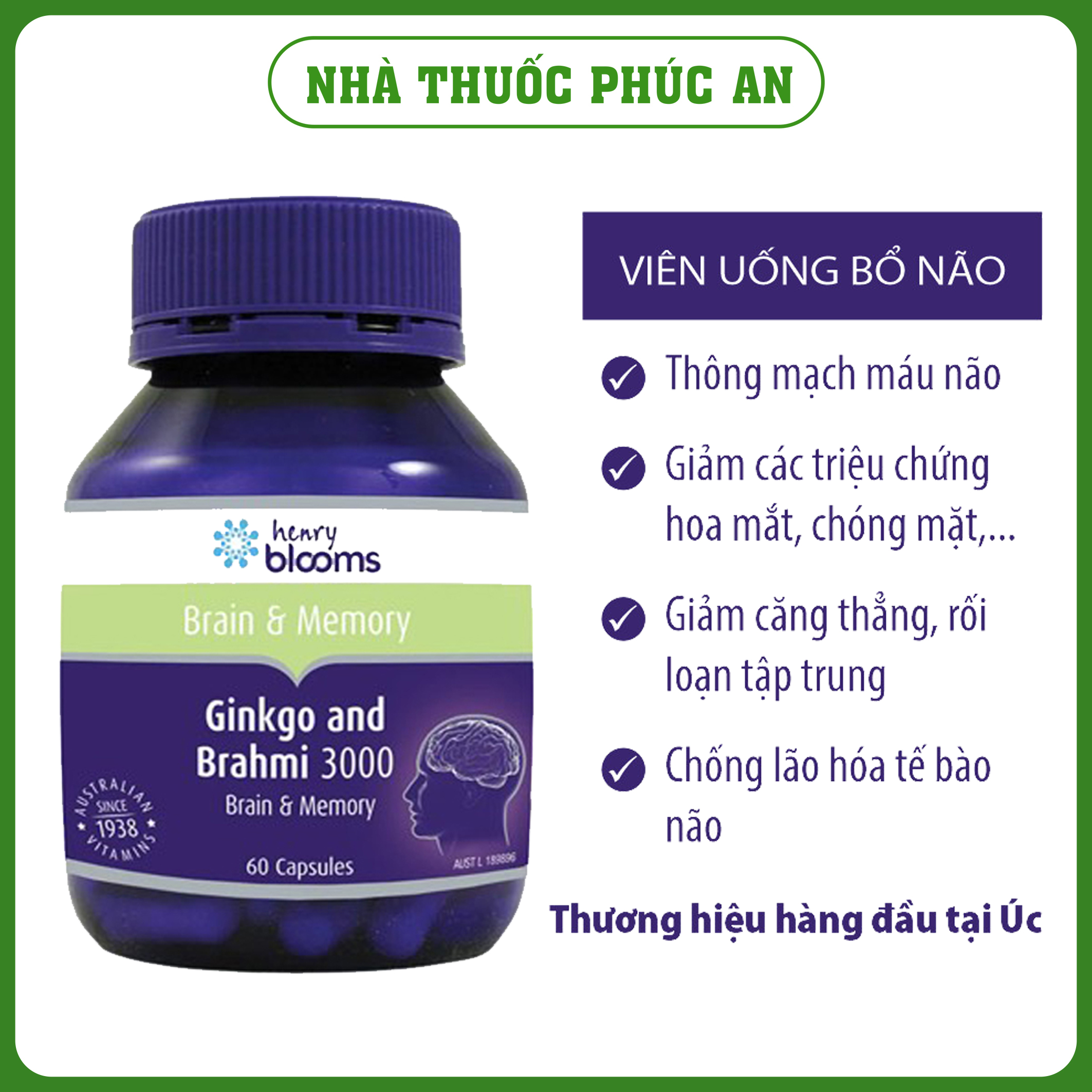 Viên uống bổ não, tăng cường trí nhớ Ginkgo and Brahmi 3000 Henry Blooms 30 viên