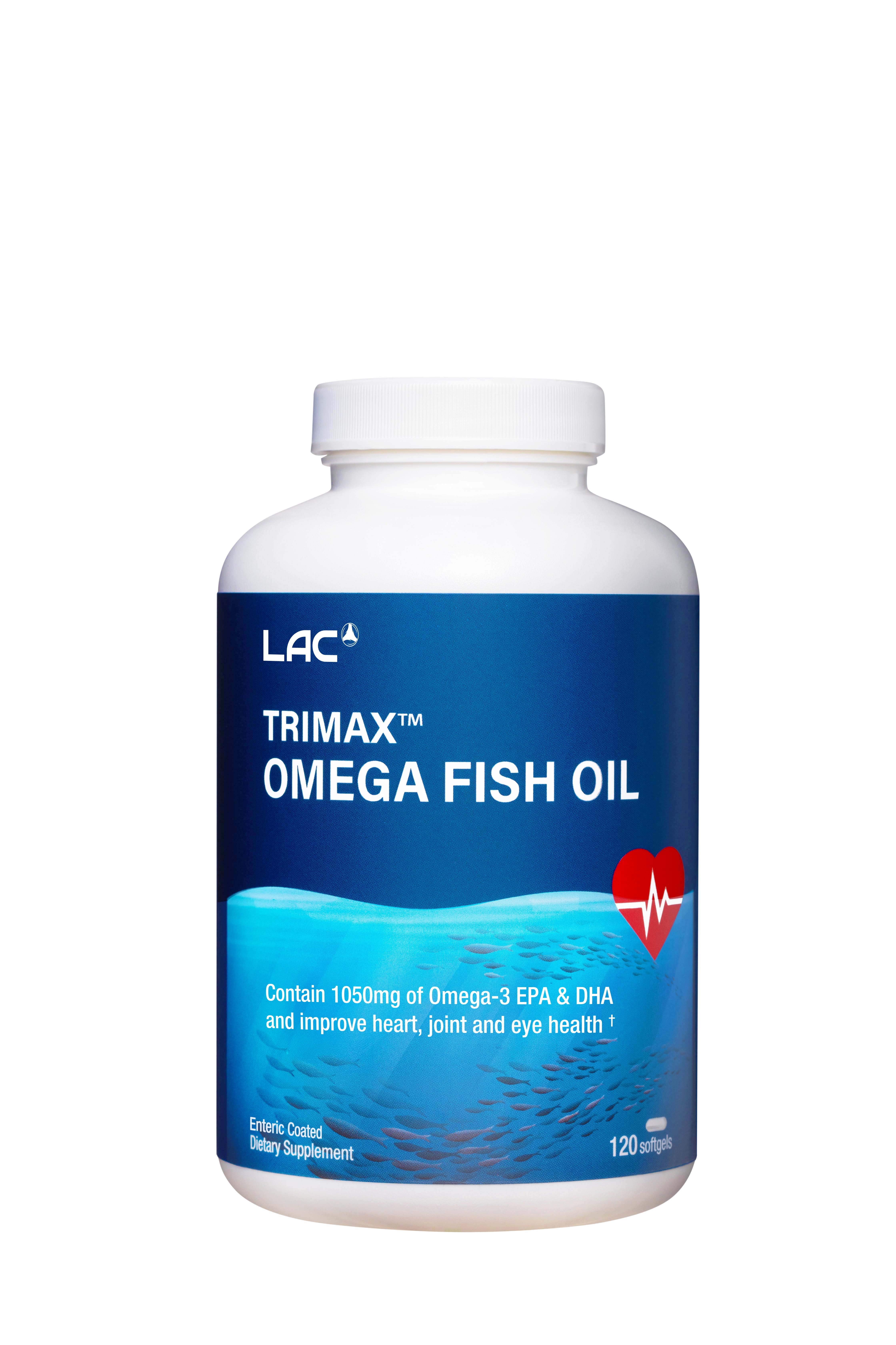 VIÊN UỐNG DẦU CÁ BỔ SUNG OMEGA HỖ TRỢ TIM MẠCH LAC TRIMAX OMEGA FISH OIL (120 VIÊN) chứa hàm lượng axit béo Omega-3 gấp 3 lần so với dầu cá thông thường giúp hỗ trợ tim mạch, tăng cường chức năng não và phục hồi sức khỏe khớp.