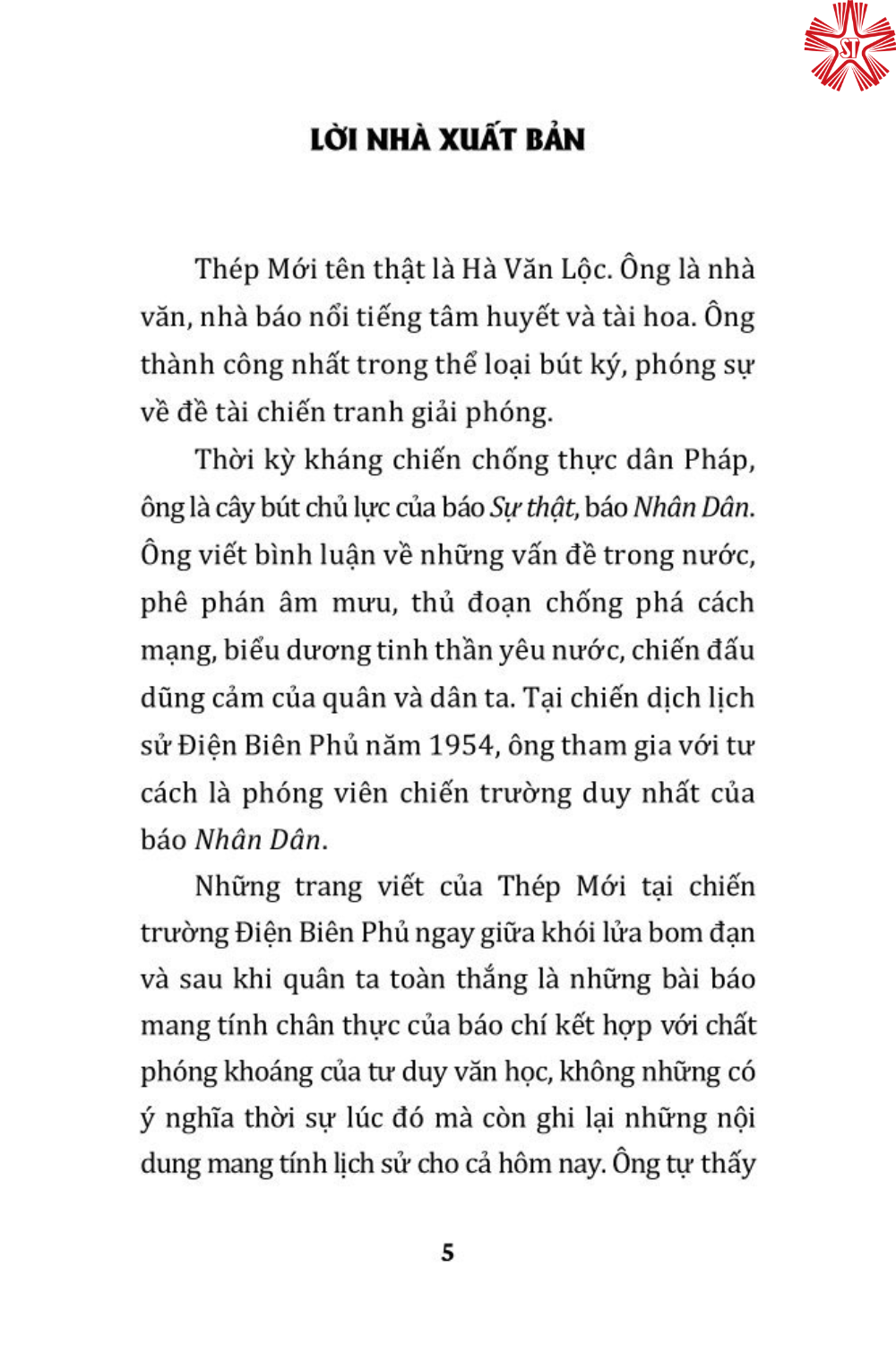 Nhân dịp kỷ niệm 70 năm chiến thắng lịch sử Điện Biên Phủ, Nhà xuất bản Chính trị quốc gia - Sự thật tái bản cuốn sách Viết về Điện Biên Phủ của Thép Mới. Anh là người chứng kiến hầu như tất cả những sự kiện chính trị quan trọng nhất của nước nhà từ tháng 8-1945 đến Đại hội lần thứ VII của Đảng năm 1991. Anh tham gia chiến dịch Điện Biên Phủ với tư cách là phóng viên chiến tranh duy nhất của báo Nhân Dân tại trận đánh lịch sử này của quân và dân ta.
