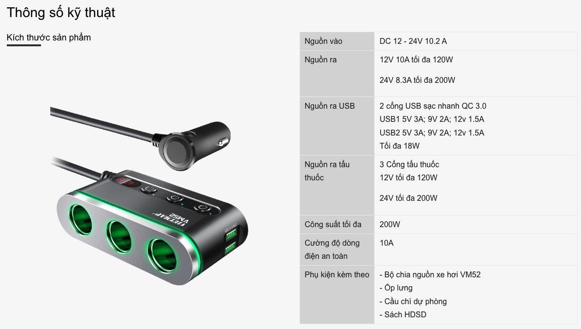 Thông số kỹ thuật VIETMAP VM52 - Bộ chia sạc ô tô đa năng - Sạc nhanh Quick Charge QC 3.0 - Hàng chính hãng
