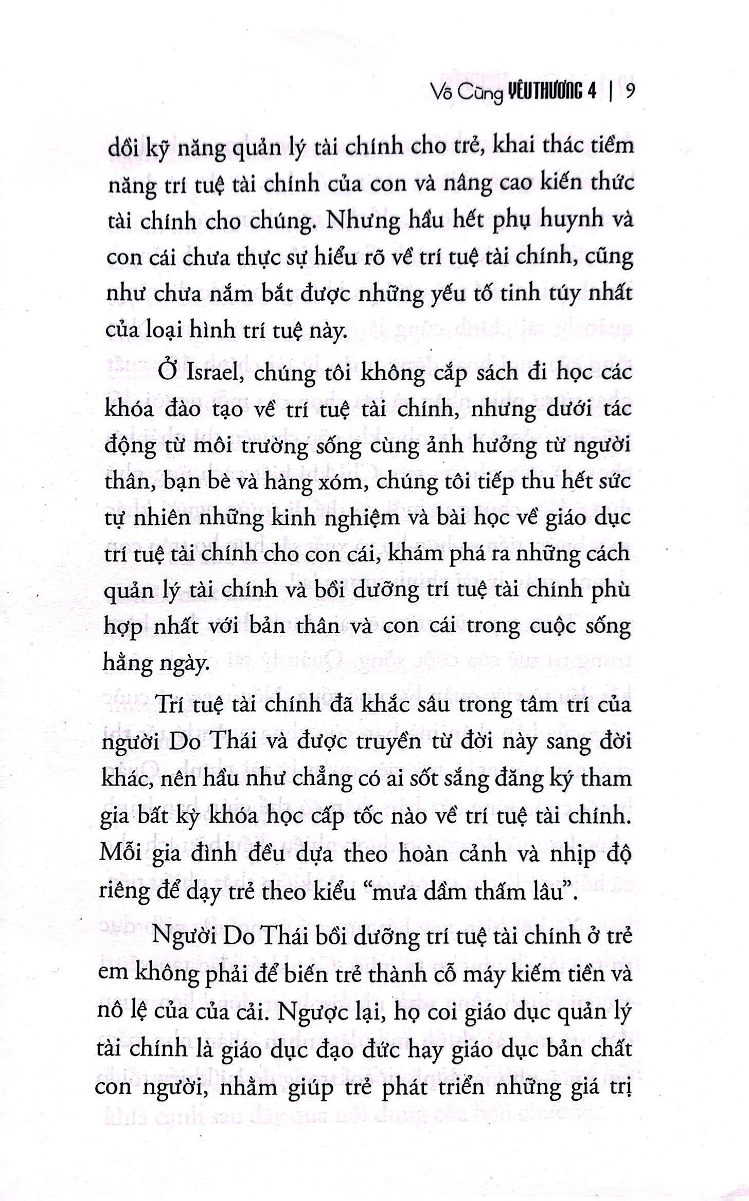 Vô cùng tàn nhẫn vô cùng yêu thương 4 là những chia sẻ của Sara Imas trong việc bồi dưỡng trí tuệ tài chính cho con trẻ, đúc kết từ những kiến thức quý giá trong nuôi dạy con của hai dân tộc Israel và Trung Quốc, các quan sát từ những gia đình xung quanh và việc áp dụng trong chính gia đình mình.