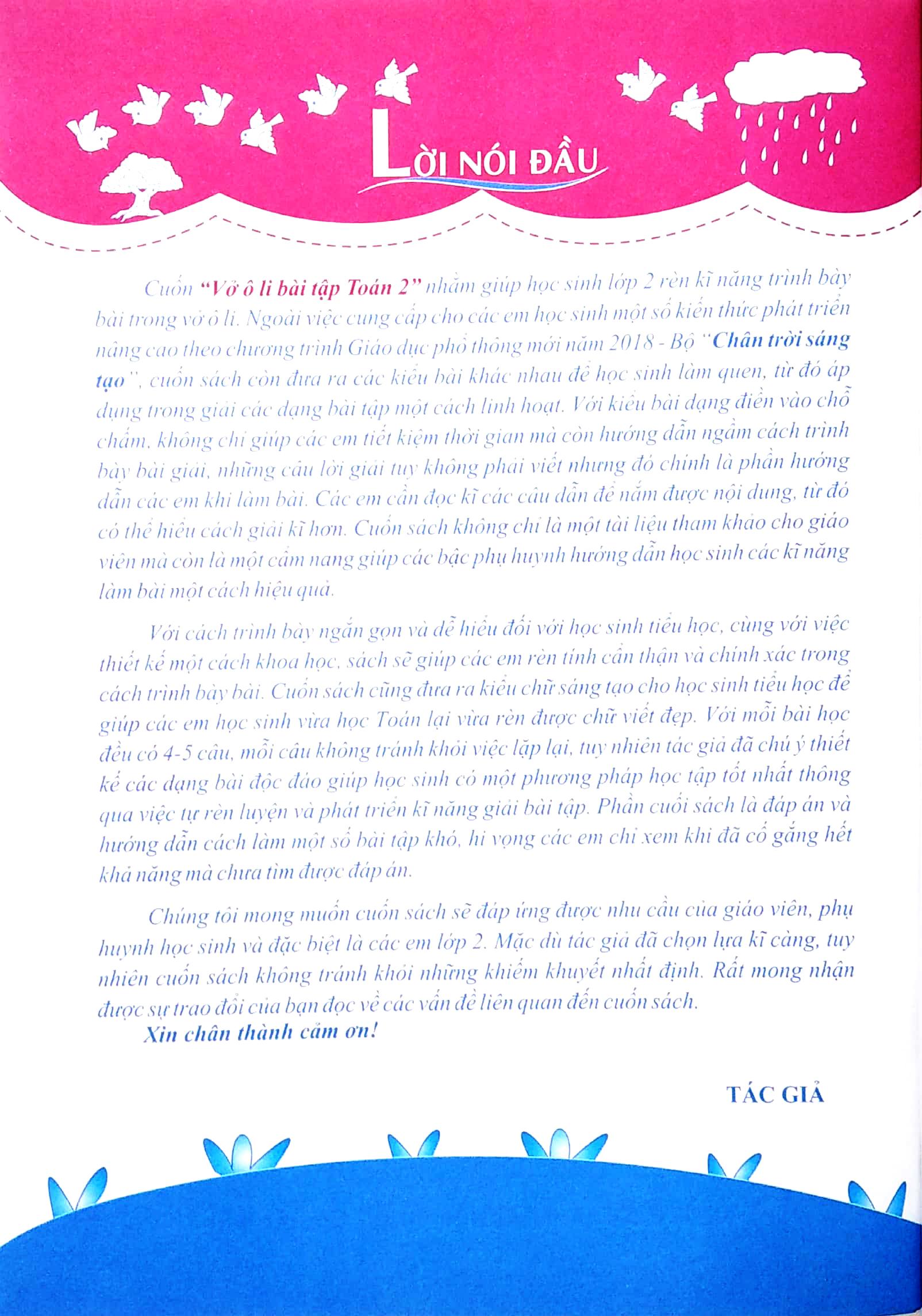 Với cách trình bày ngắn gọn và dễ hiểu đối với học sinh tiểu học, cùng với việc thiết kế một cách khoa học, sách sẽ giúp các em rèn tính cần thận và chính xác trong cách trình bày bài.