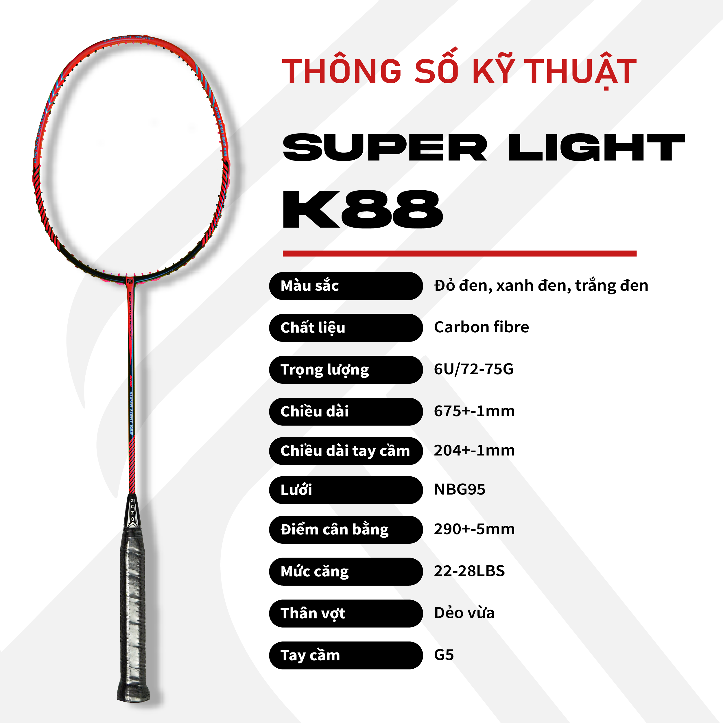 Thông số kỹ thuật Vợt Cầu Lông Kuno Super Light K88, 6U Thân Dẻo, Công Thủ Toàn, Căng Sẵn 10kg