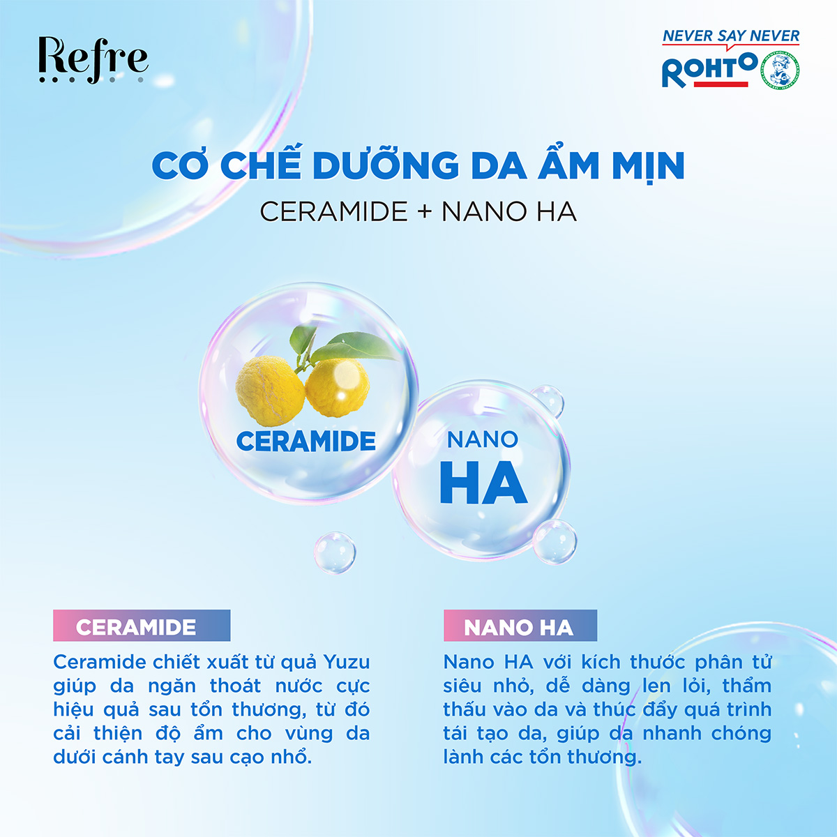 Nano HA và Ceramide giúp dưỡng ẩm da tối ưu, giúp vùng cánh ẩm mịn, tự tin.