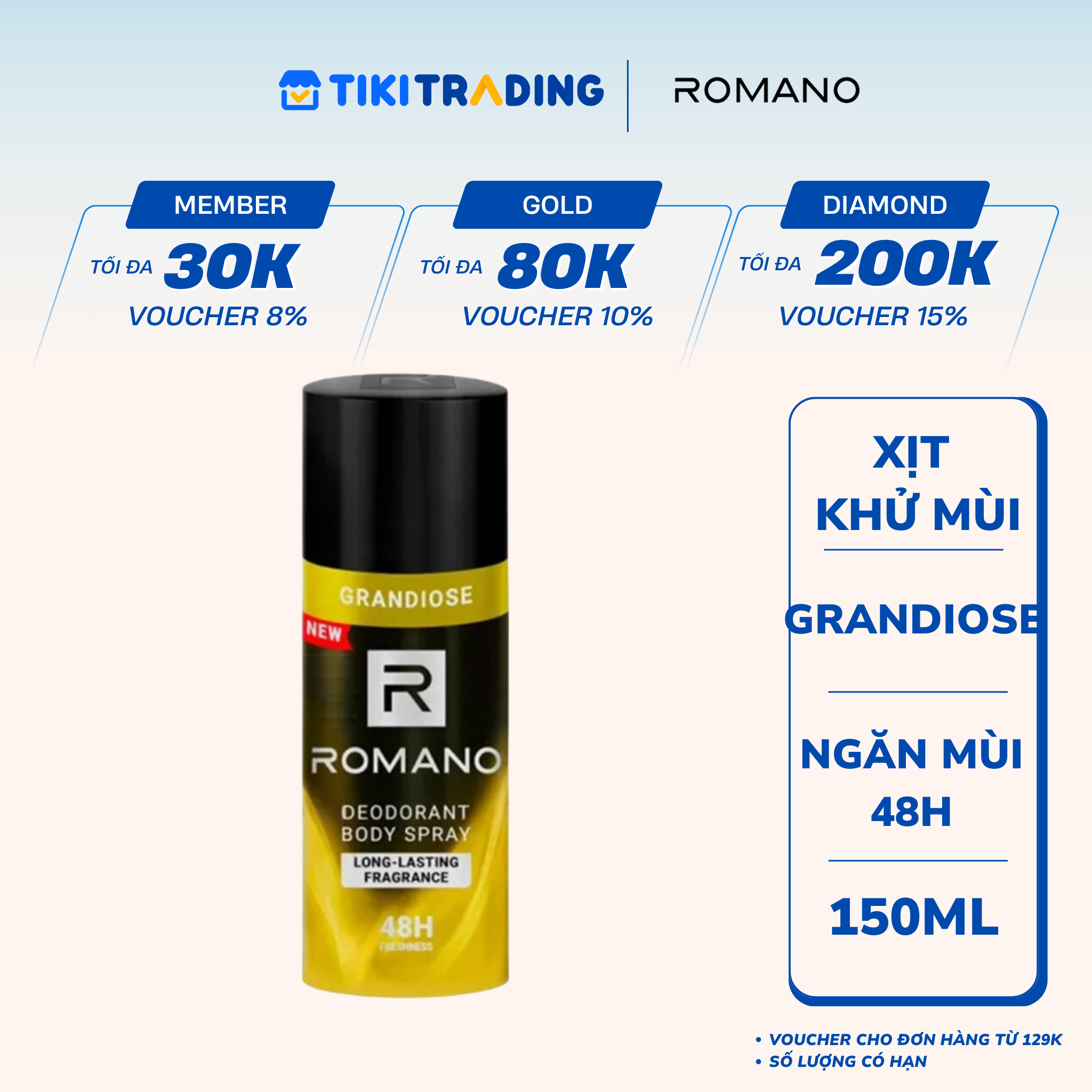- Xịt khử mùi nam Romano grandiose mang đến hương thơm nam tính, mạnh mẽ, giúp bạn tự tin suốt cả ngày dài.