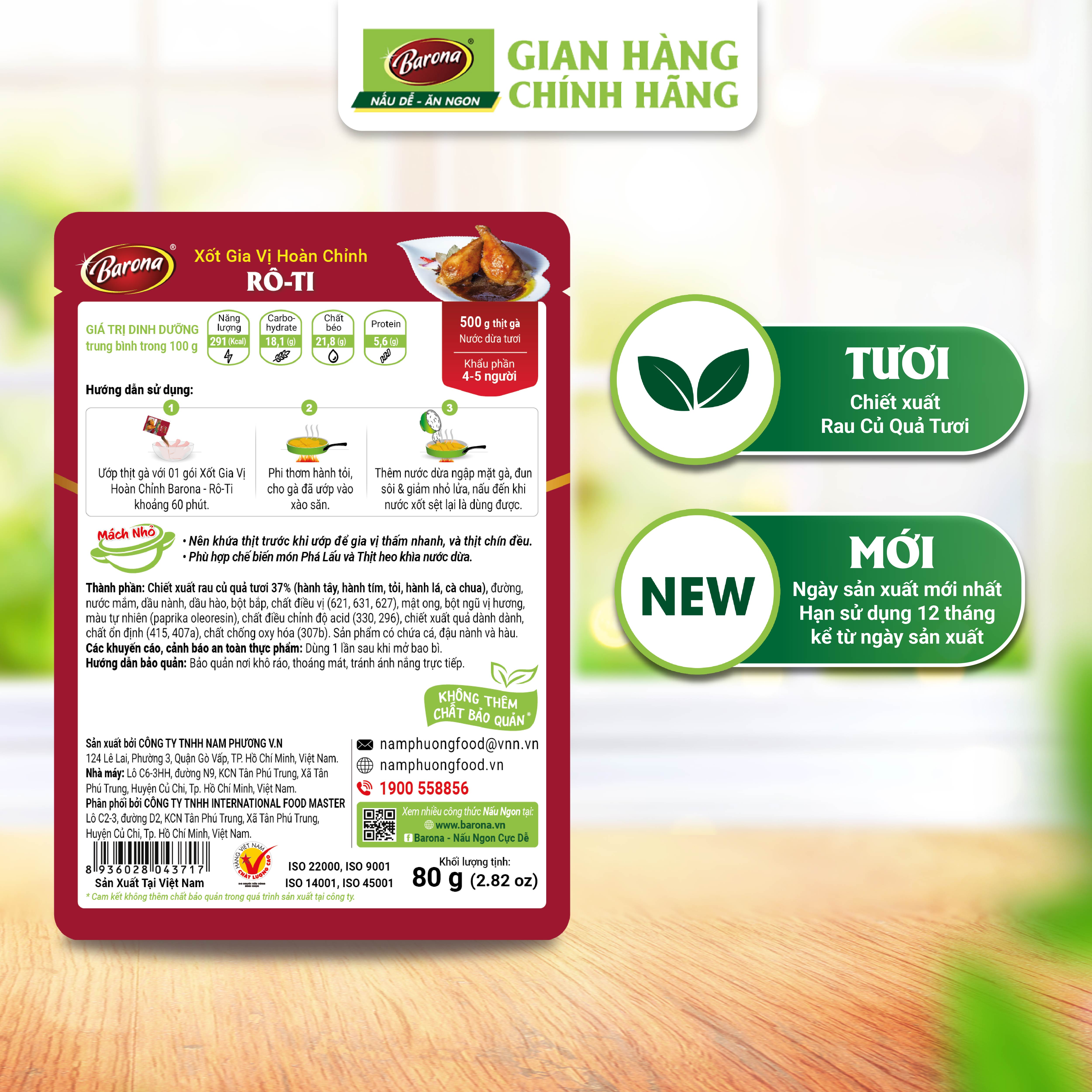 Xốt Gia Vị Hoàn Chỉnh Barona là công thức phối trộn độc đáo giữa CHIẾT XUẤT RAU CỦ QUẢ TƯƠI như hành, tỏi, me, cà chua…cùng các loại gia vị truyền thống được chọn lọc, đem đến món ngon chuẩn vị trong tích tắc mà KHÔNG CẦN NÊM NẾM thêm bất kỳ gia vị nào khác.