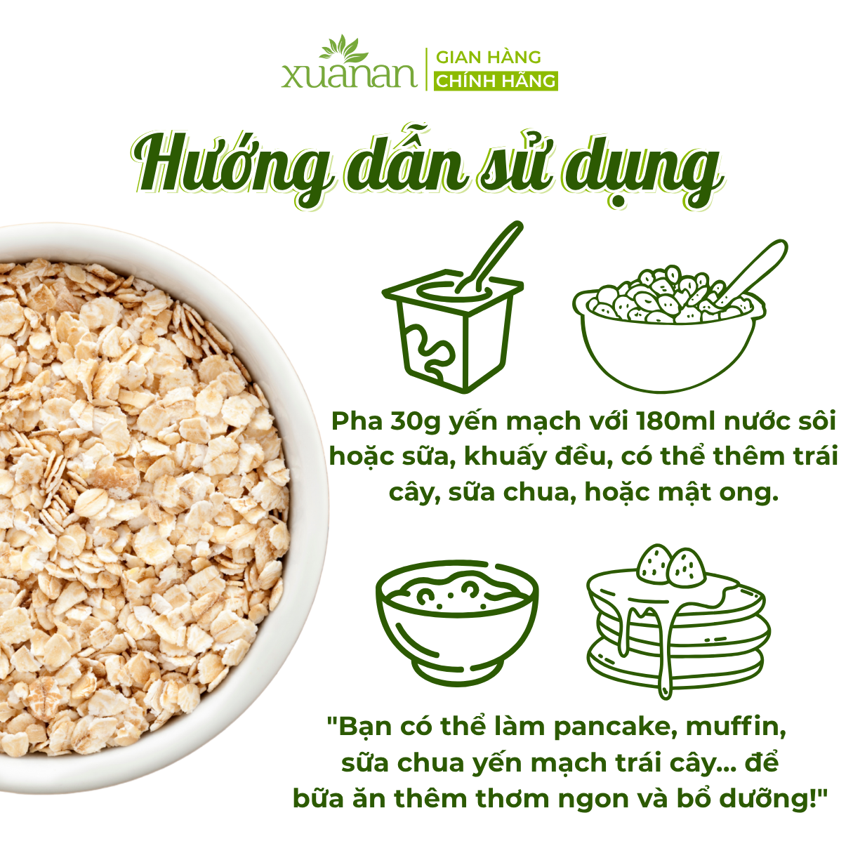Pha 30 g yến mạch hữu cơ với 180 ml nước sôi, khuấy đều trước khi dùng. Có thể thêm đường, sữa (sữa bột, sữa tươi), hoặc trái cây tuỳ theo sở thích.