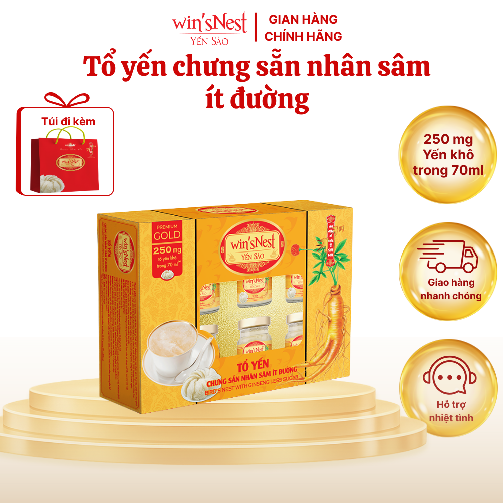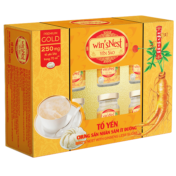 Yến sào cao cấp win'sNest tổ yến chưng sẵn nhân sâm ít đường 250mg (20%) được sản xuất từ nguồn yến đảo thiên nhiên, là một sản phẩm của công ty wincofood. Được sản xuất bằng phương pháp cổ truyền trên dây chuyền đạt tiểu chuẩn an toàn thực phẩm.
